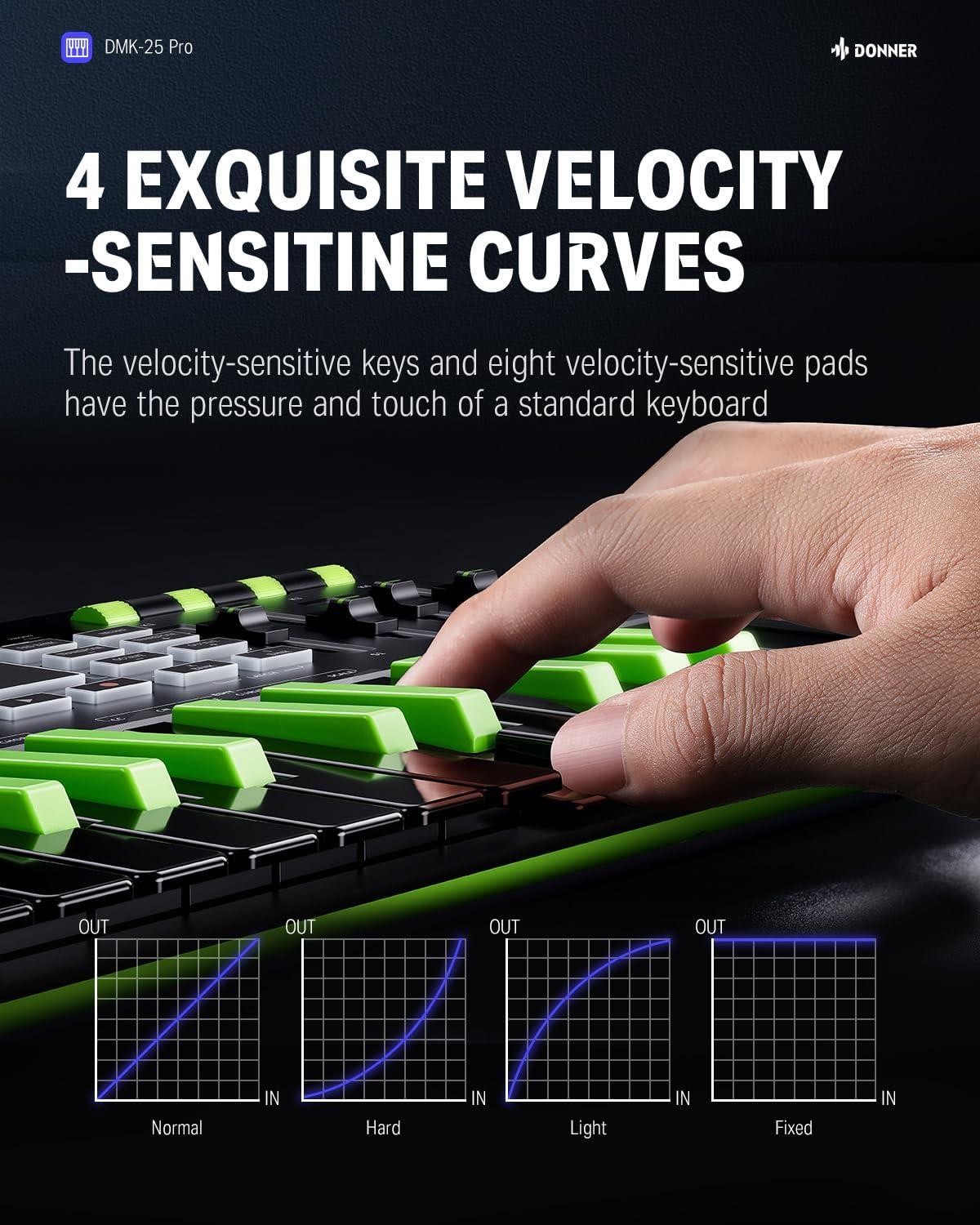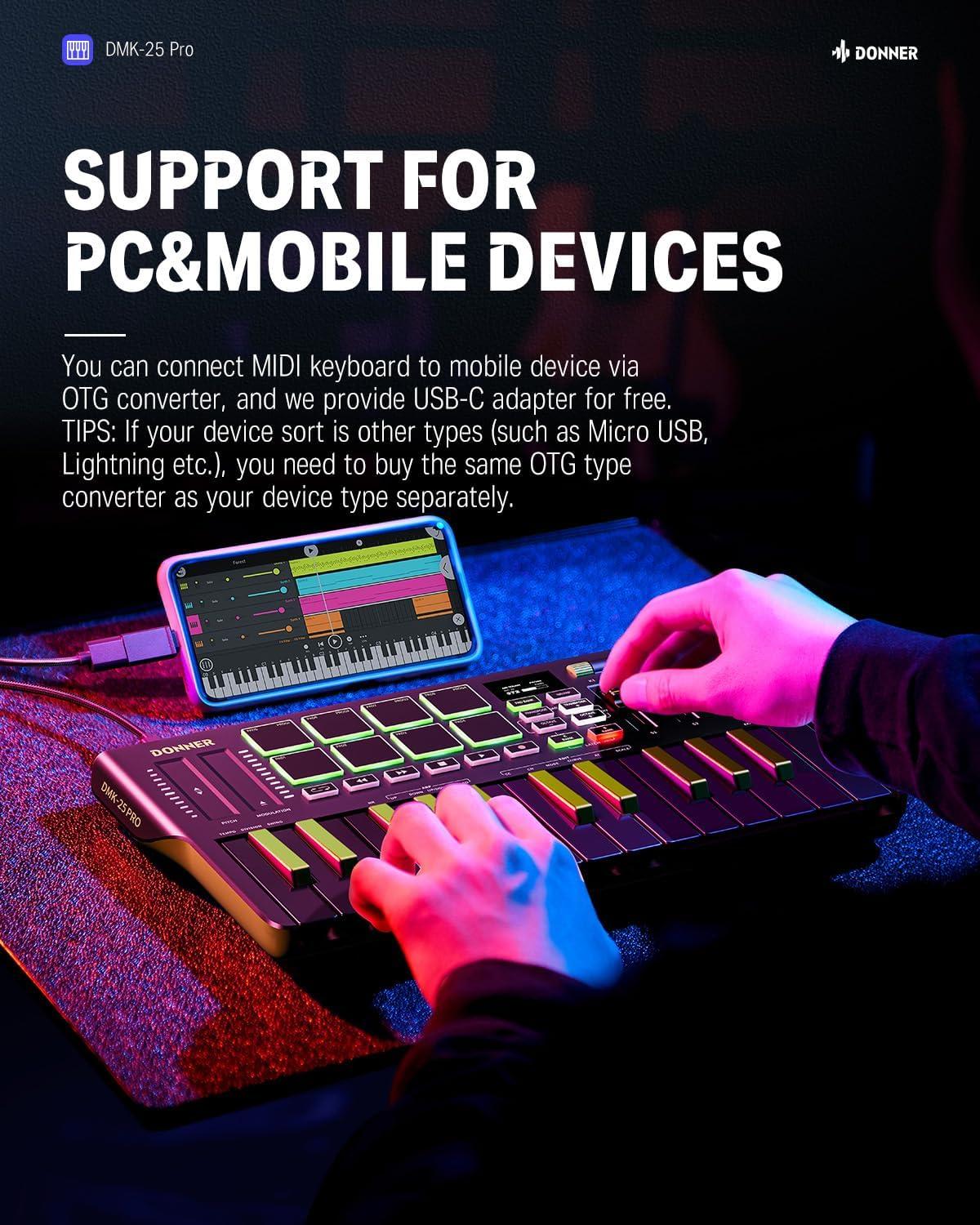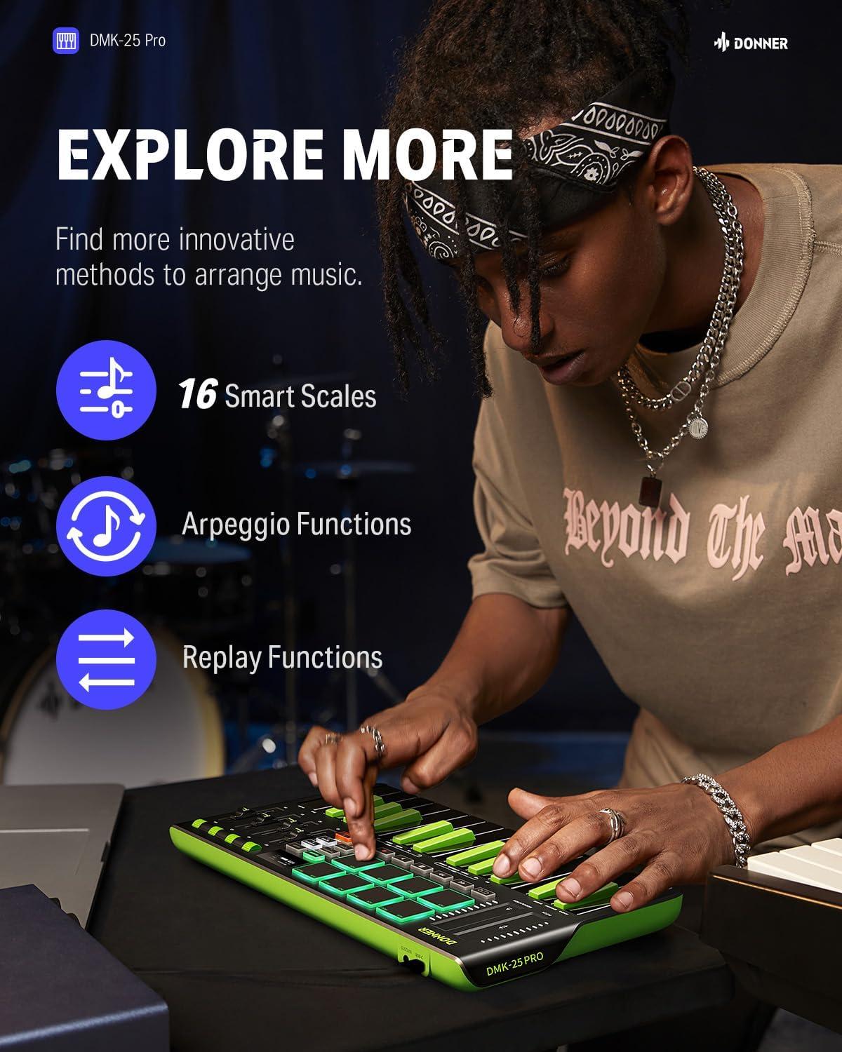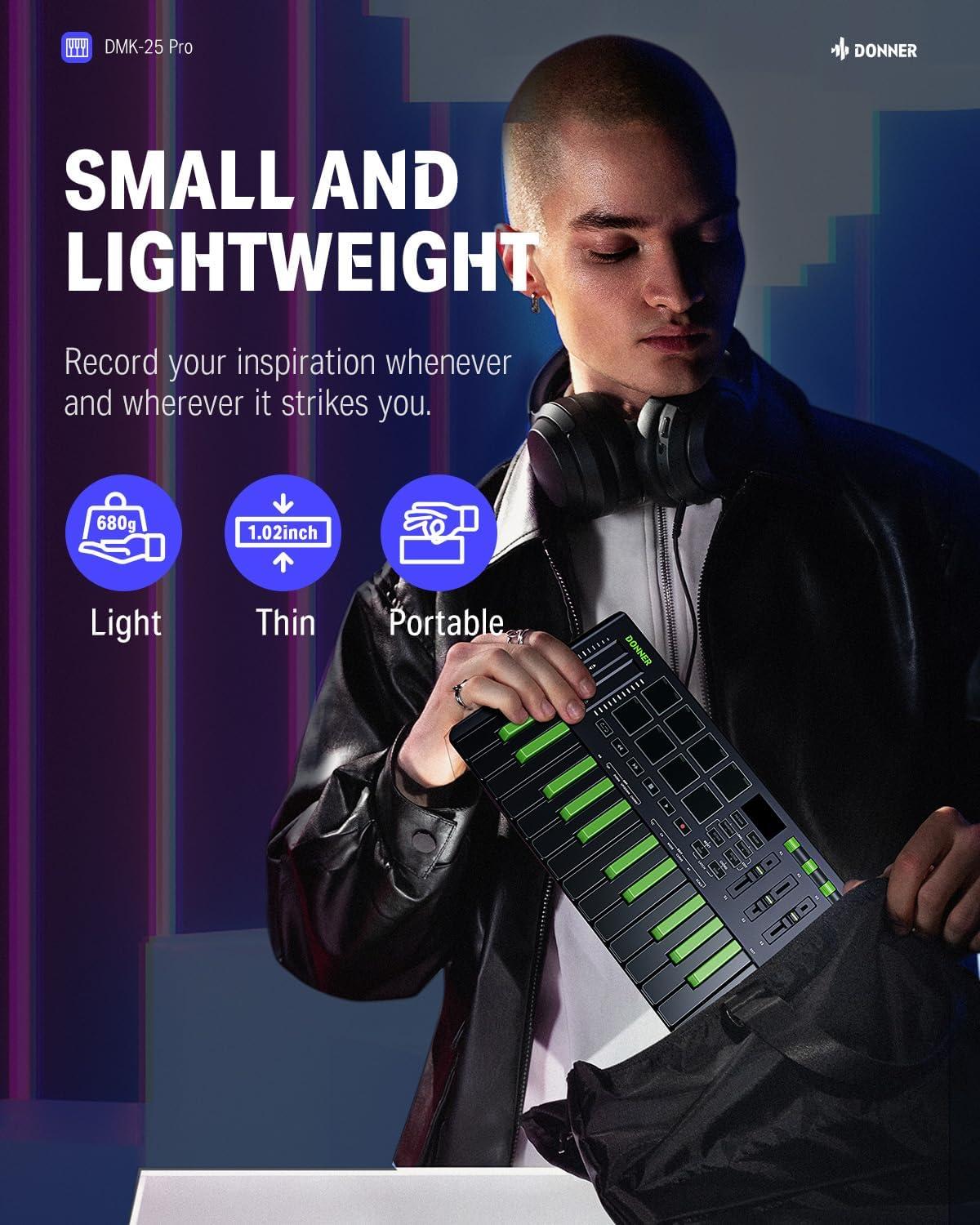 【Real-time Multi-Mode Control】DMK-25 Pro MIDI controller unleashes creativity with arpeggio, note repeat, & chord functions. Craft music clips anytime, anywhere. Enhance performance joy & explore endless playability