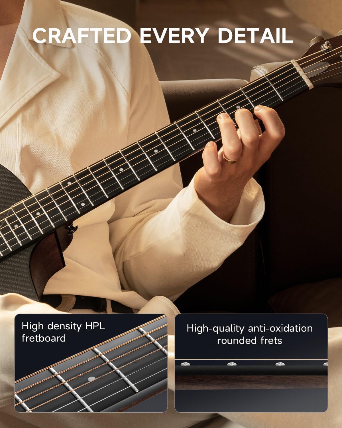☑️[Always in Tune] >>Forget about one-piece molded carbon fiber guitars. This acoustic guitar’s soundboard is crafted from 3K pure carbon fiber fabric, layered with precision. Rain or shine, scorching heat or freezing cold, this guitar will give you a stable playing experience