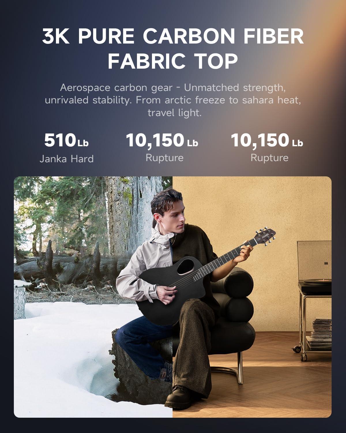 ☑️[Always in Tune] >>Forget about one-piece molded carbon fiber guitars. This acoustic guitar’s soundboard is crafted from 3K pure carbon fiber fabric, layered with precision. Rain or shine, scorching heat or freezing cold, this guitar will give you a stable playing experience
