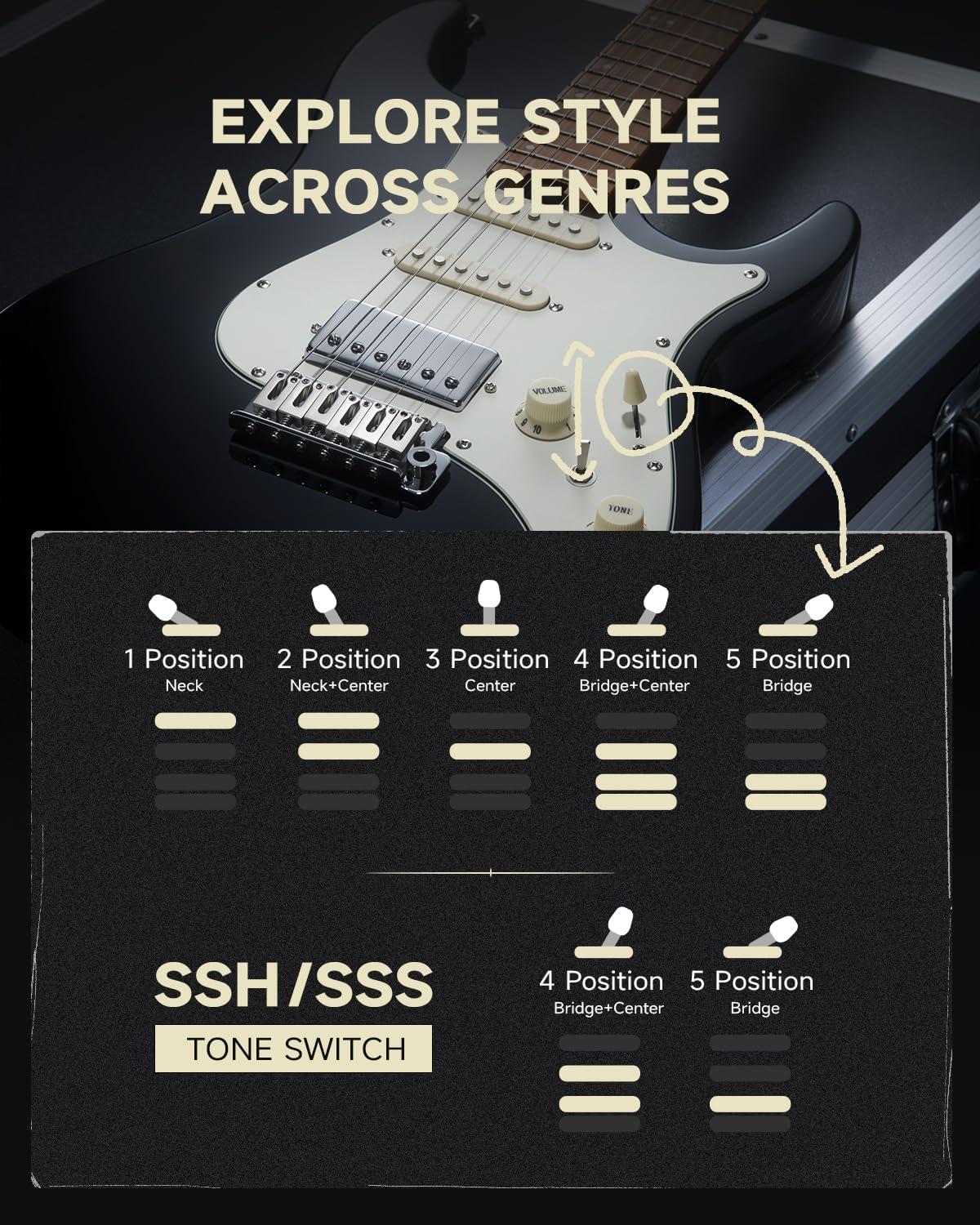 【H-S-S Pickups with Coil Split System】Donner’s custom HSS pickups deliver high-output tones designed for dynamic distortion. 5-way switching unlocks 7 tonal modes for versatile sound across multiple genres. The push-pull tone knob activates coil splitting, offering authentic single-coil tones with clear and articulate sound—without volume loss.