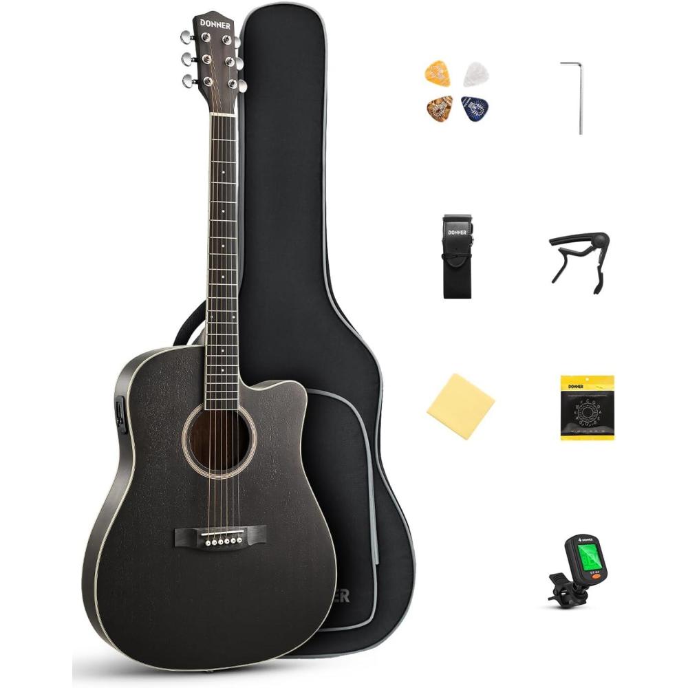 Donner 41-Inch Acoustic Electric Guitar Kit for Beginners, Full Size with Capo, Picks, Tuner, Strings, Strap - Black(black)