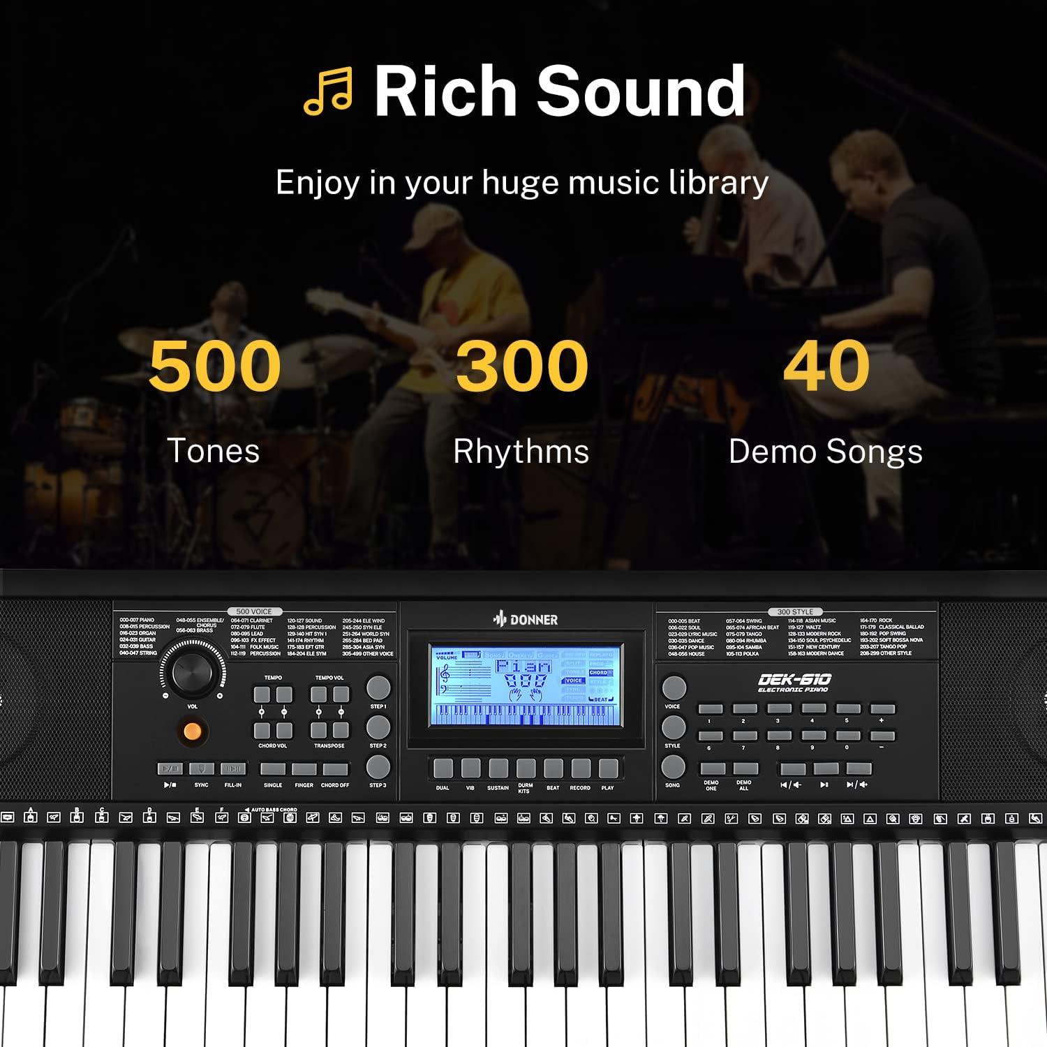 [61 Key Keyboard Piano] DEK-610 music keyboard is equipped with a huge music library, with 500 tones, 300 rhythms, 40 demo songs, and you can create your own music or do band performances. A great choice for professional players.