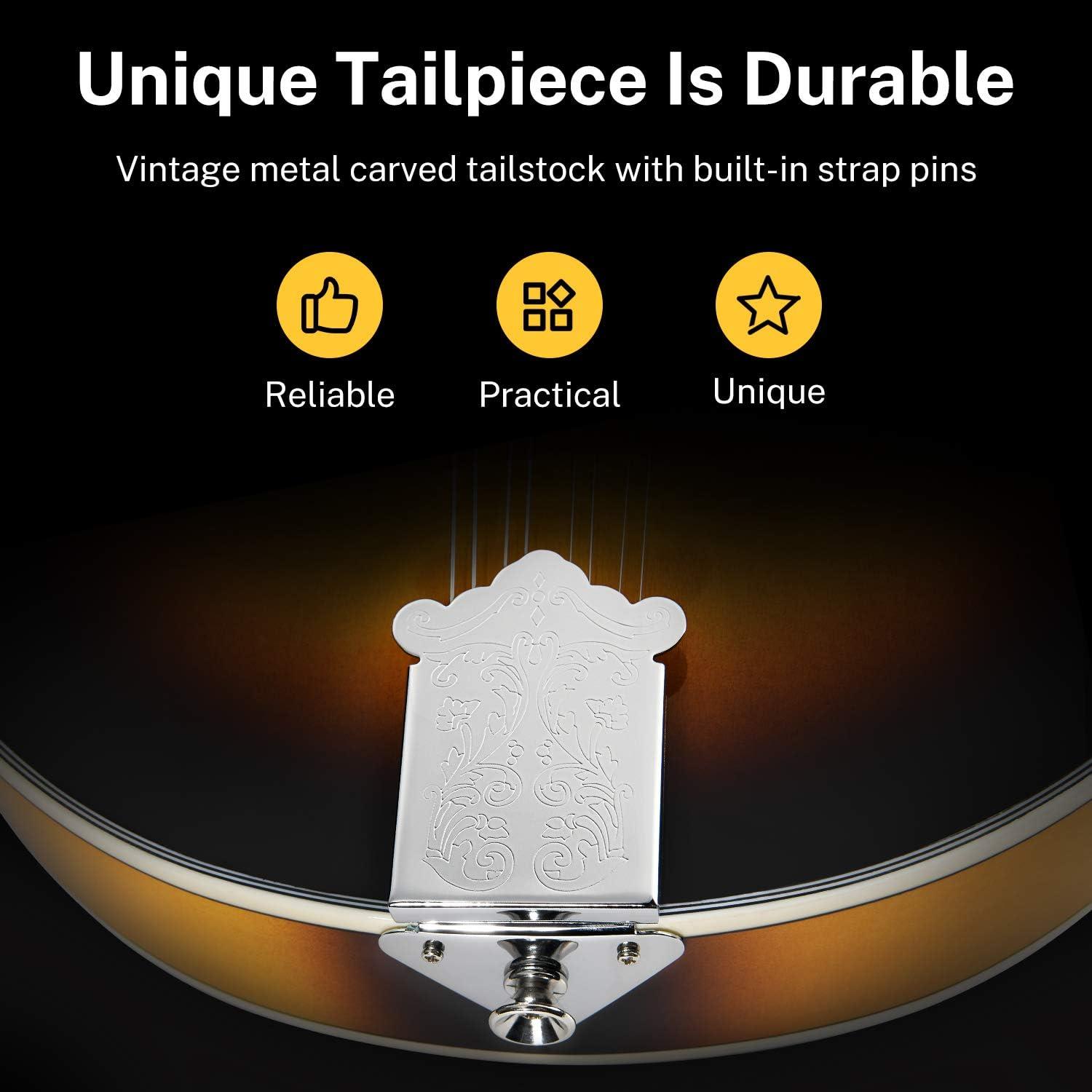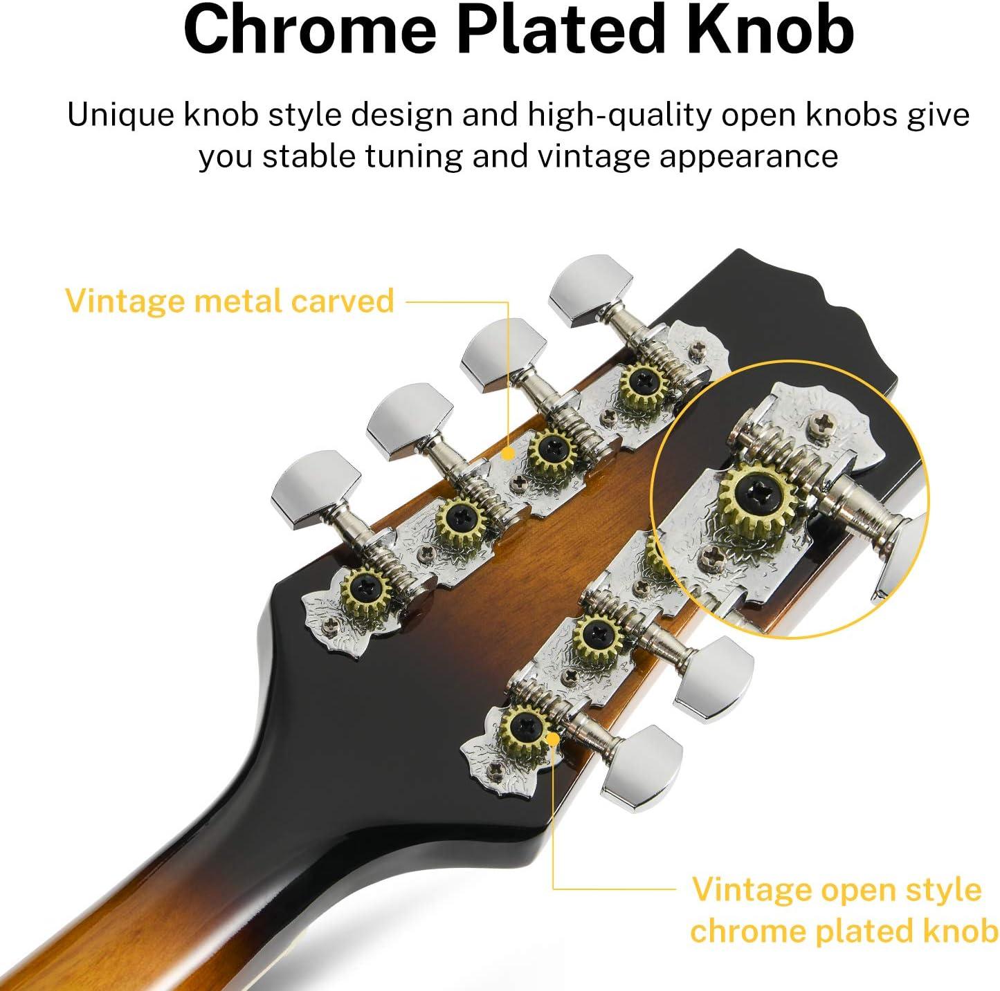 Solid Exquisite Craftsmanship: Chrome plated open gear tuners are easy to tune and keep mandolin playing in tune. Carved patterned tailpiece make mandolin more exquisite. Adjustable compensating bridge has metal knob and solid wood. Easy to adjust