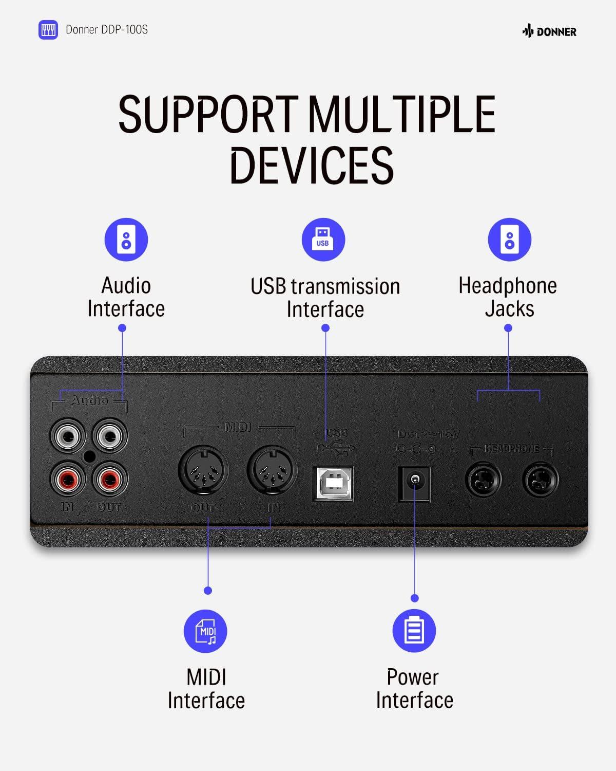 【More Functions Create More Possibilities】DDP-100S 88-key digital piano expands your musical palette with 200 sounds, 200 rhythms, & 100 demo songs. Includes auto-tuning, metronome, transposition, MIDI In/Out for comprehensive practice