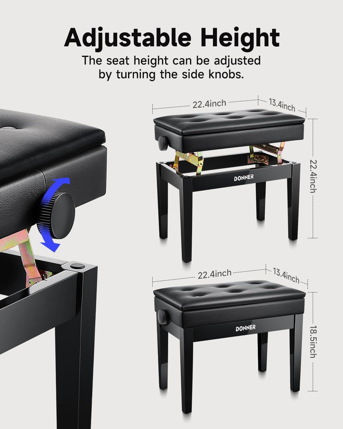 ๐๐๐ฃ๐ฎ๐ฌ๐ญ๐๐๐ฅ๐ ๐ก๐๐ข๐ ๐ก๐ญ โ This adjustable piano bench can be adjusted within a height range of 18.5″-22.4″ through the lifting device on both sides. The height-adjustable design makes it suitable for people of all ages, whether children or adults, they can set the perfect height to enjoy their musical journey