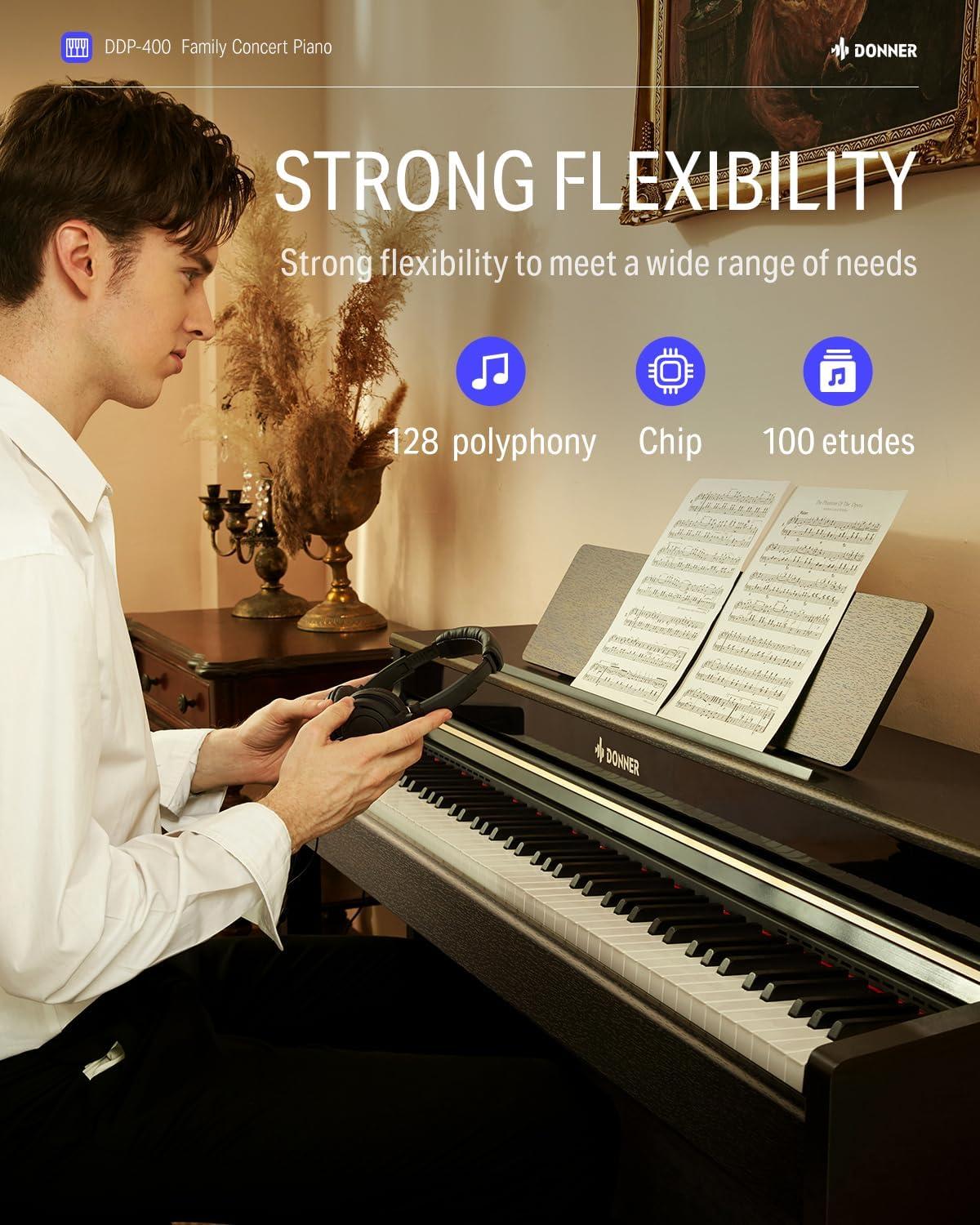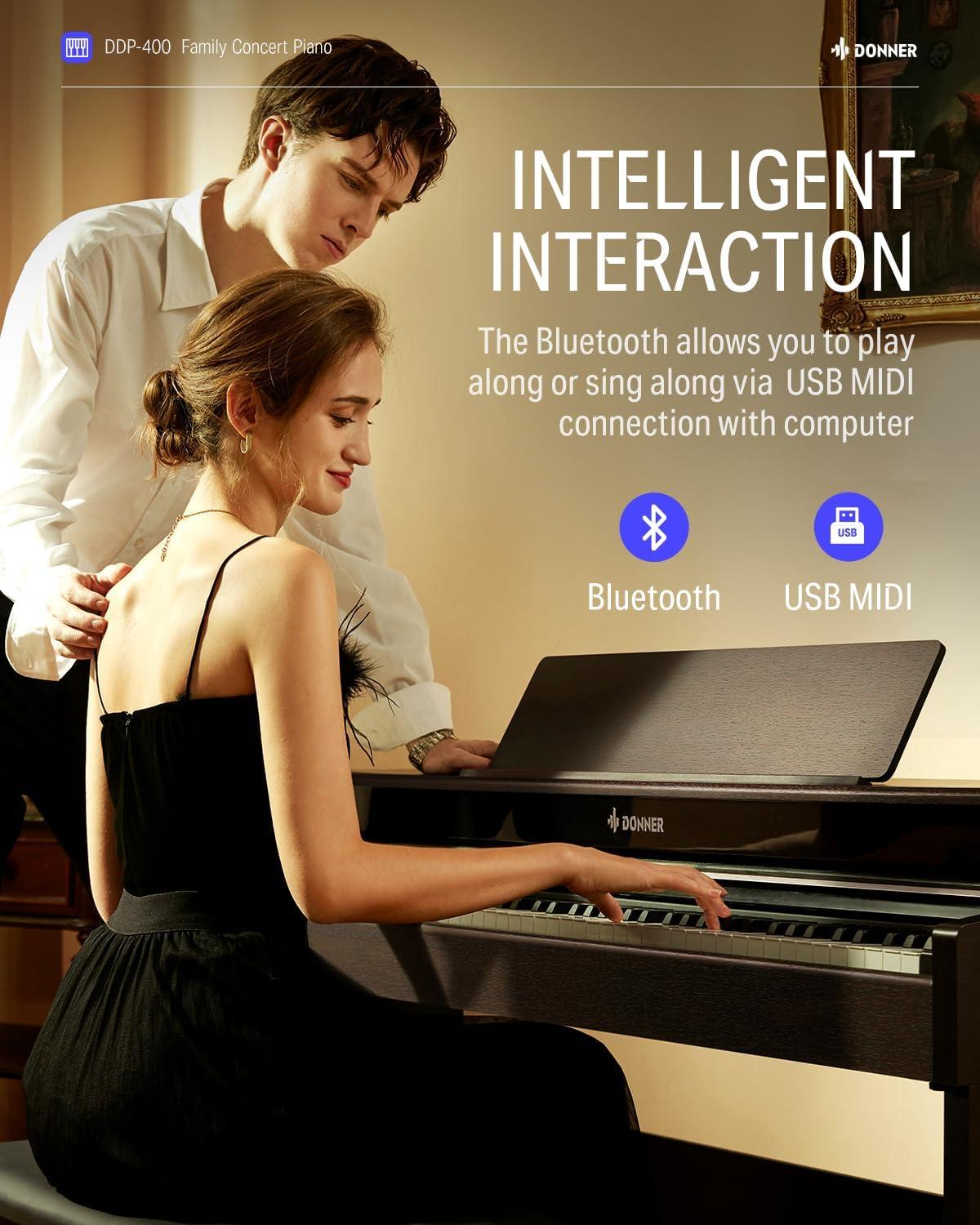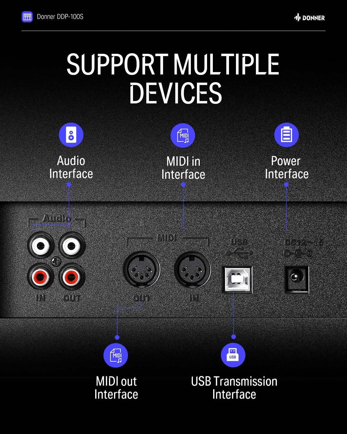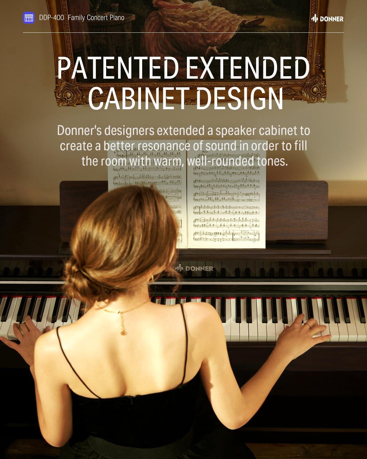【 Extended a speaker cabinet】Donner's designers extended Digital piano speaker cabinet, which increases the length of the strings, have a larger soundboard area, the volume and timbre are larger and fuller than ordinary pianos, the harmonics are richer, and the resonance is stronger. The rounded streamline and warm wooden textures also adds a vintage look to your home, studio or practice room.Suitable for compact family, practice, party playing,small music concert.