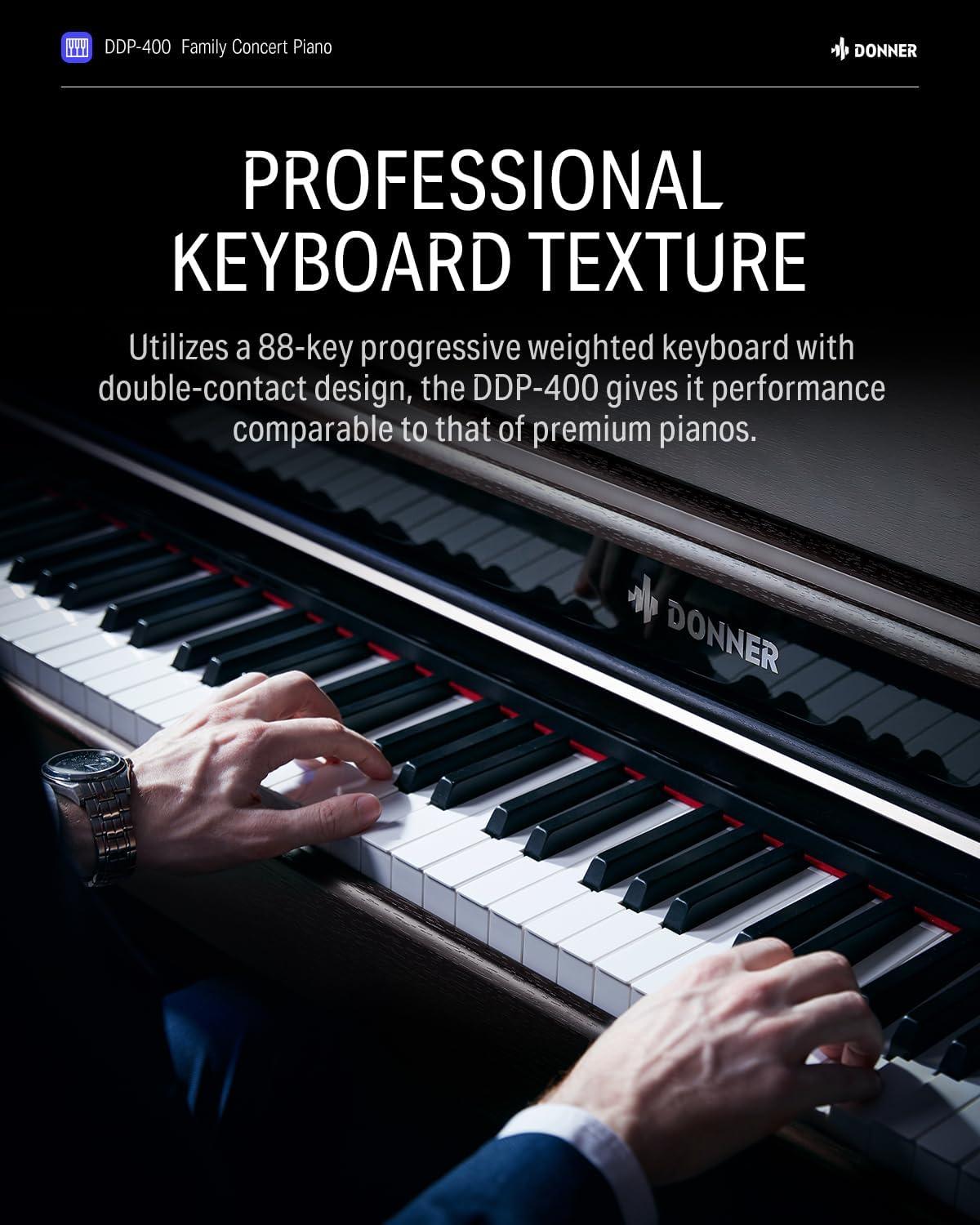 【Weighted Keyboard Piano】DDP-400 keyboard with full-sized 88 harmmer progressive weighted keyboard and double-contact design, precisely matching the finger strength changes, extremely restoring the piano's finger strength, is heavier in the low end and lighter in the high end. The DDP-400 gives it performance comparable to that of premium pianos.