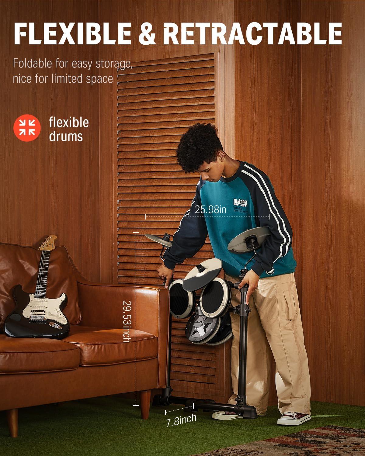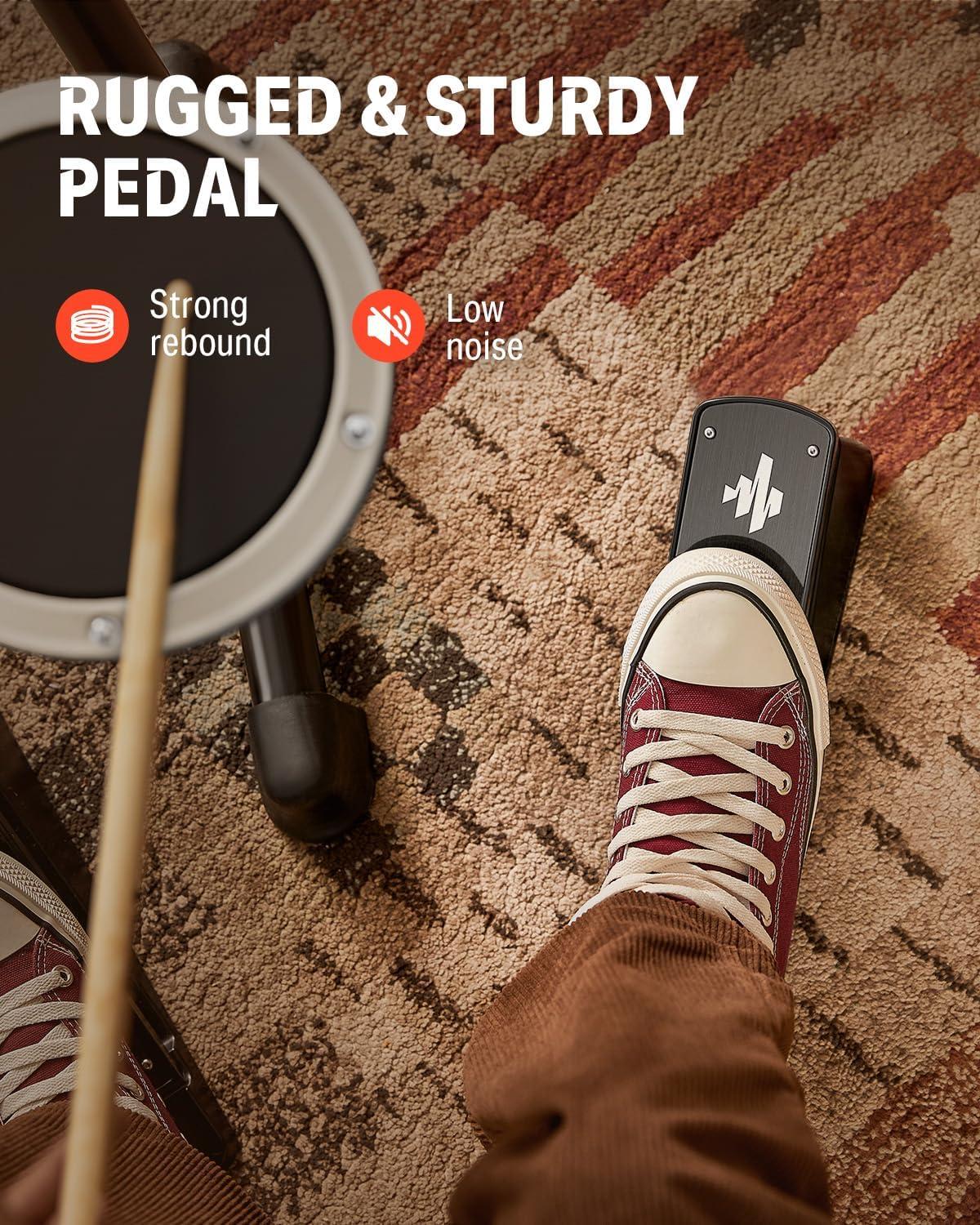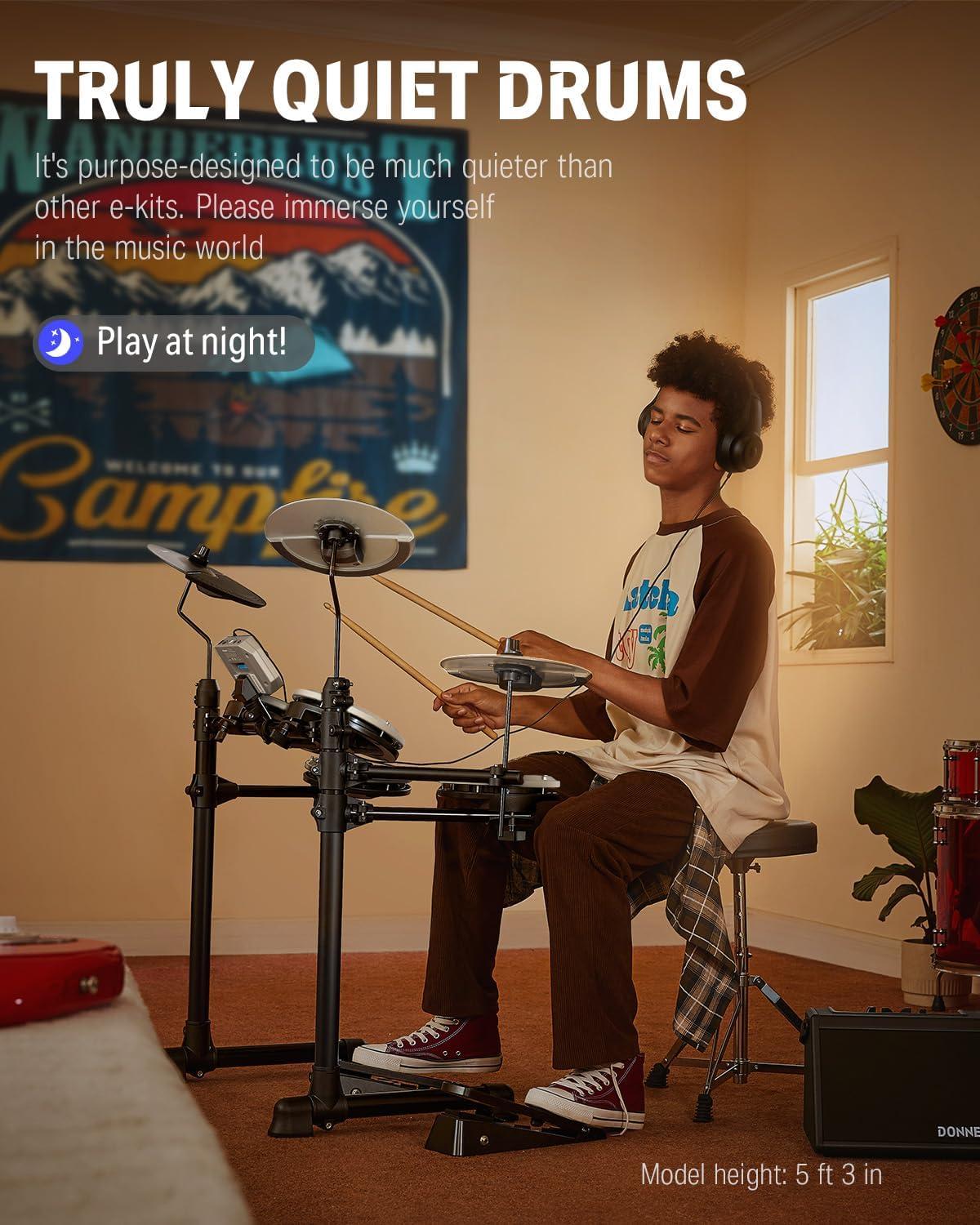 【Powerful Educational Function】This beginner drum kit is loaded with powerful educational features, including a drum coach, 30 accompaniment tracks, and fun exercises that help beginners improve their playing skills and enjoy every note! Also supports Donner Play APP.