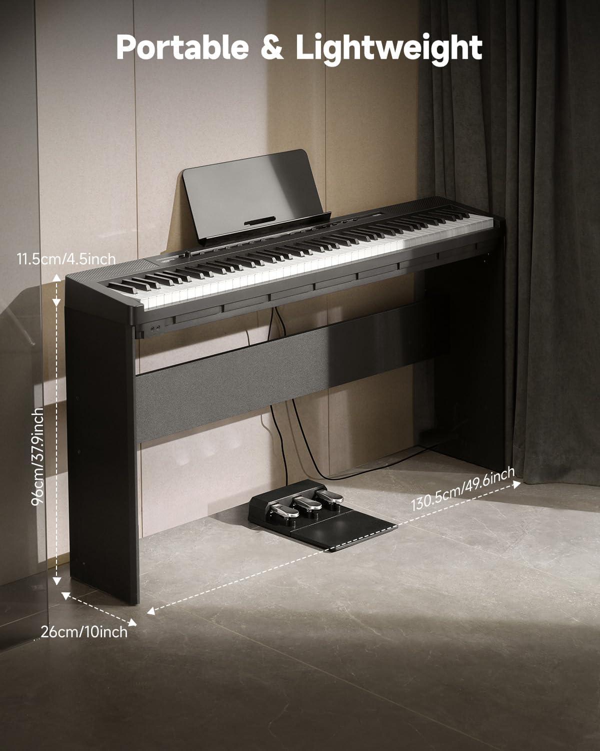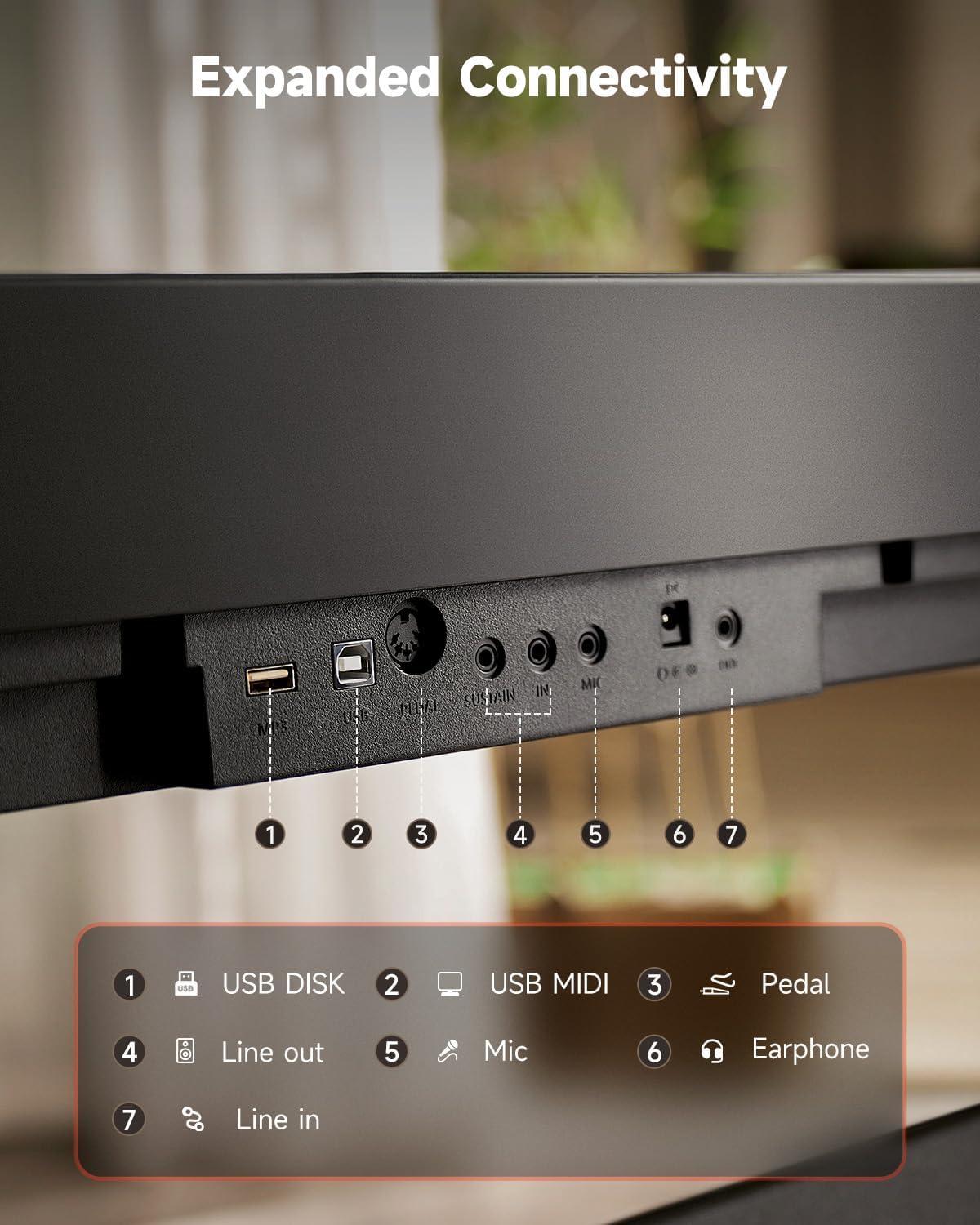【238 TONES & 200-NOTE POLYPHONY】This piano keyboard 88 keys can explore 238 different instrument tones including ukulele, drums, and bass. 200-note polyphony ensures clarity in complex compositions with effects like chorus and reverb.