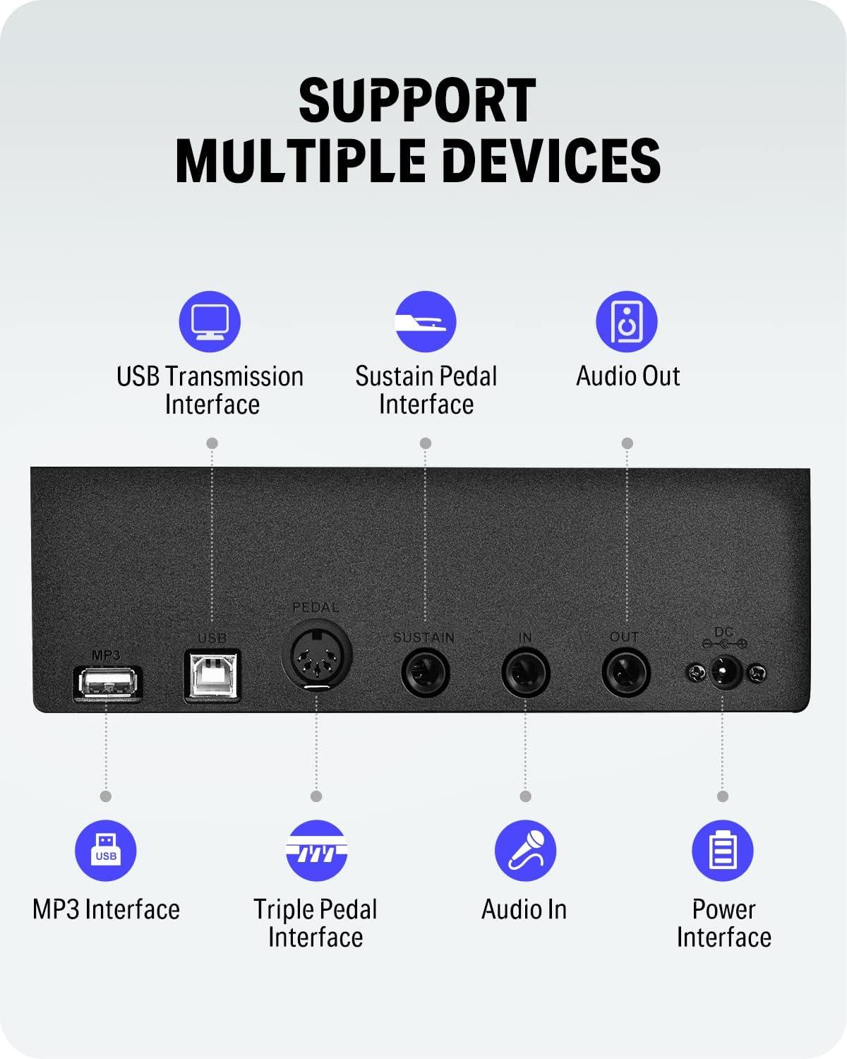 🎹 【238 Tones & 128 Polyphony】 The 88-key weighted keyboard loaded with 238 types of tone like Ukulele, drum, bass, etc. vividly presenting voices of different instruments, arousing your keen to learn music. The digital electric piano with 128-note max polyphony, players could distinguish tone clearly in Chorus & Reverb under various occasions.