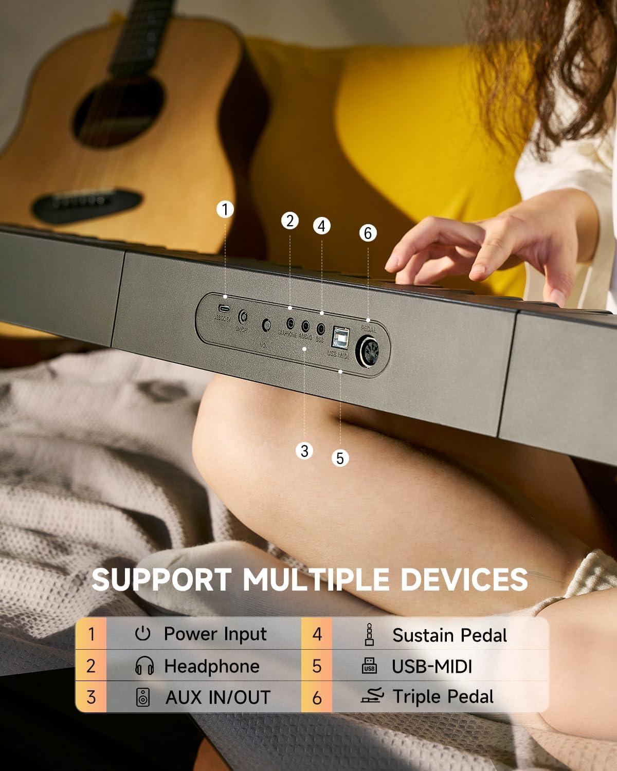 𝐕𝐞𝐥𝐨𝐜𝐢𝐭𝐲-𝐬𝐞𝐧𝐬𝐢𝐭𝐢𝐯𝐞 𝐊𝐞𝐲𝐛𝐨𝐚𝐫𝐝: 88 keys, simulates the real sound and touch of acoustic pianos, providing excellent key feedback for beginners; Highly responsive touch sensitivity, offers a comfortable playing experience