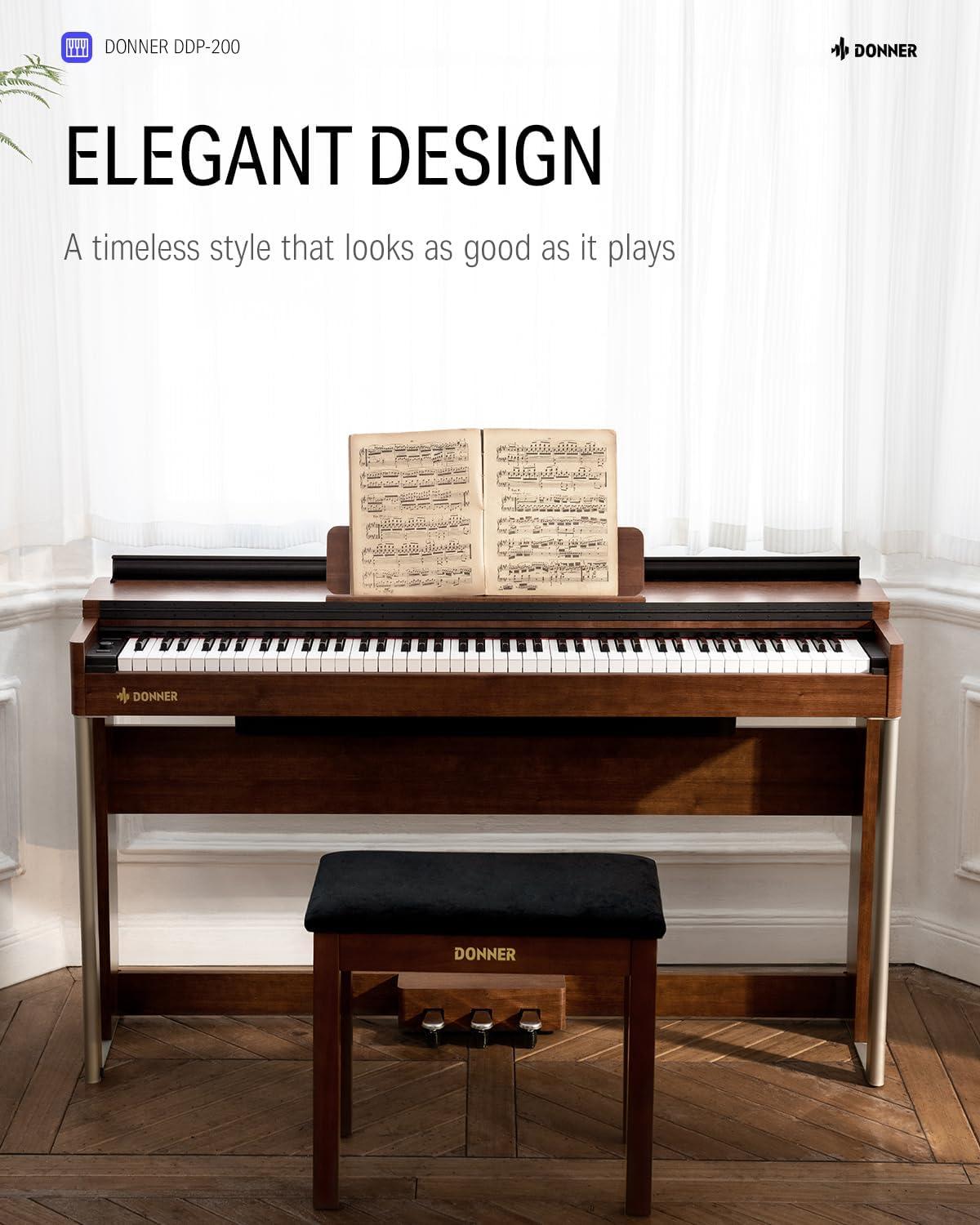 𝐀𝐩𝐩𝐞𝐚𝐥𝐢𝐧𝐠 𝐖𝐨𝐨𝐝 𝐆𝐫𝐚𝐢𝐧 𝐅𝐢𝐧𝐢𝐬𝐡 – Donner DDP-200 digital piano features appealing wood grain body finishes and rich dark oak colors. The incredibly light-luxury home style is simple to match with contemporary interior design. It's a light, expensive, and attractive musical instrument as well as a gorgeous piece of furniture