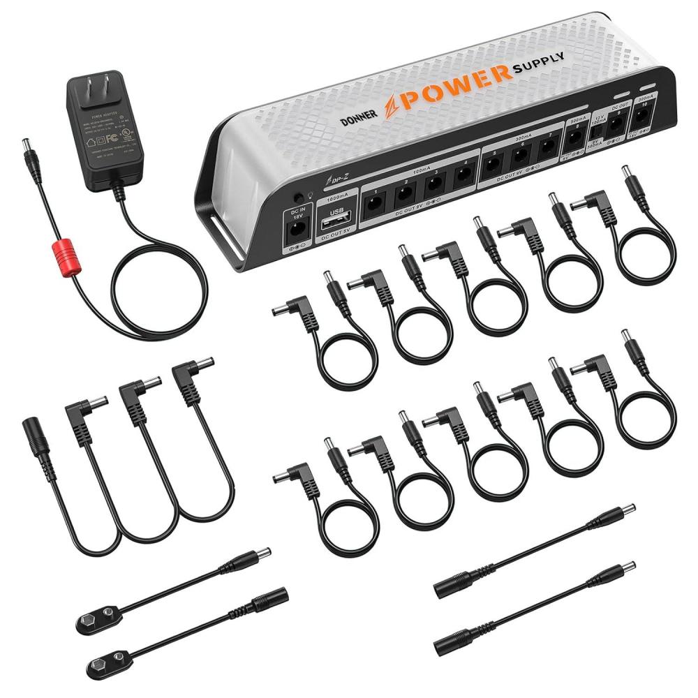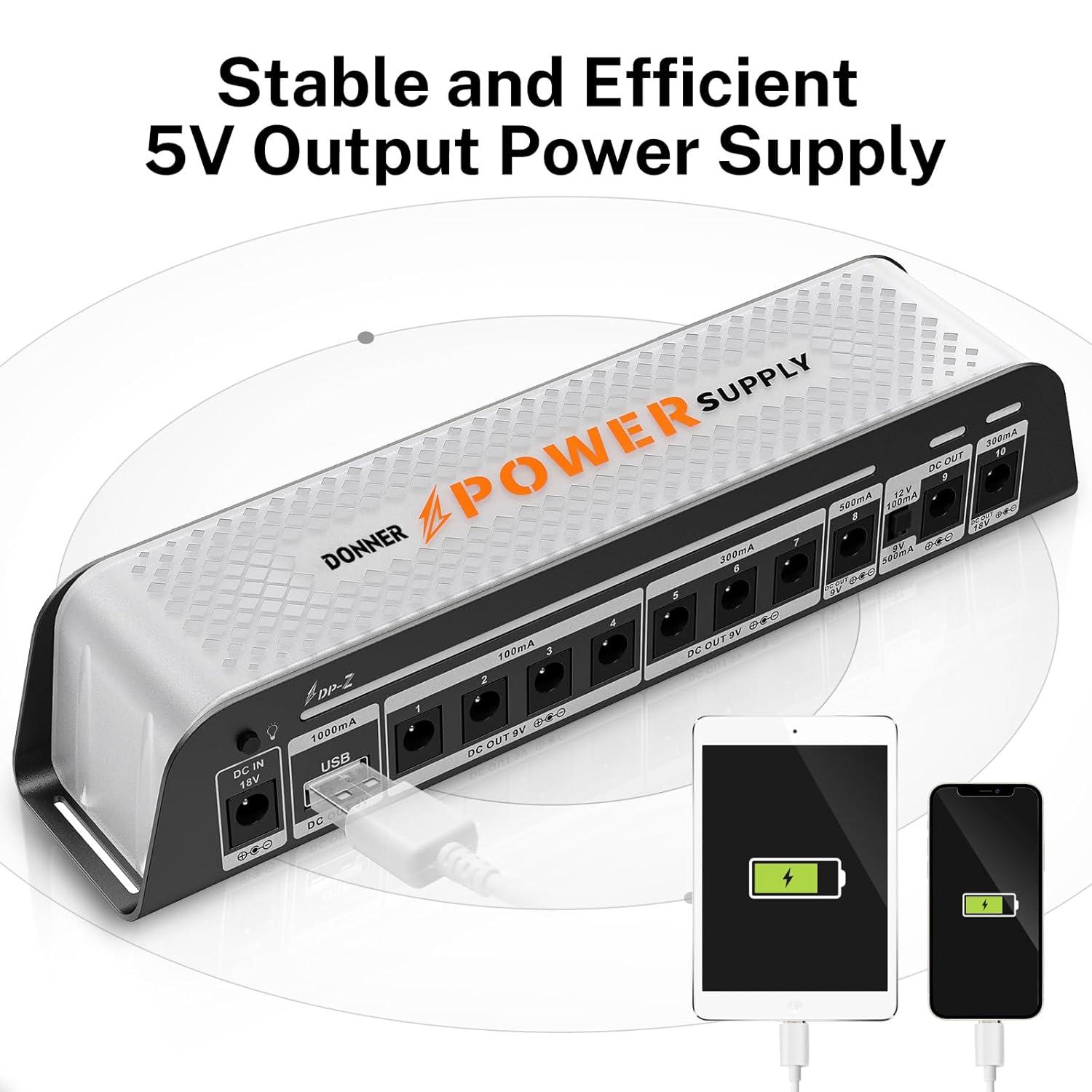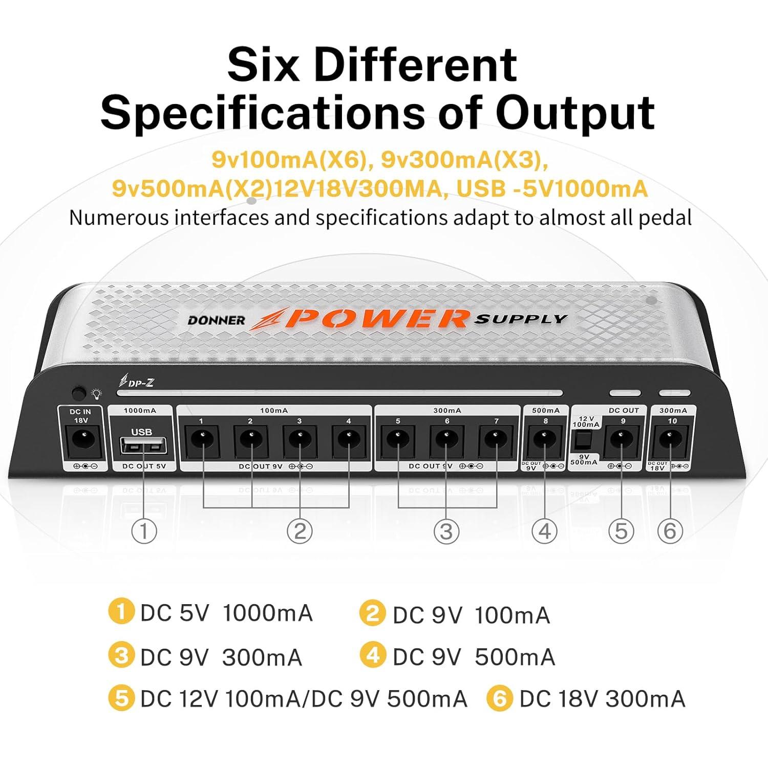 【10 Isolated Outputs + 1 USB charge port 】 Donner DP-Z 9V Guitar Pedal Power Supply has 10 outputs ,which includes 4 x 9V 100mA, 3 x 9V 300mA, 1 x 9V 500mA, 1 x 9V/12V 500mA, 1 x 18V 300mA with 1 x DC 18V input, 1 x USB charge port. 10 Isolated Output ,5v 1000 mA USB charge port Meet the power demand of Mobile devices .
