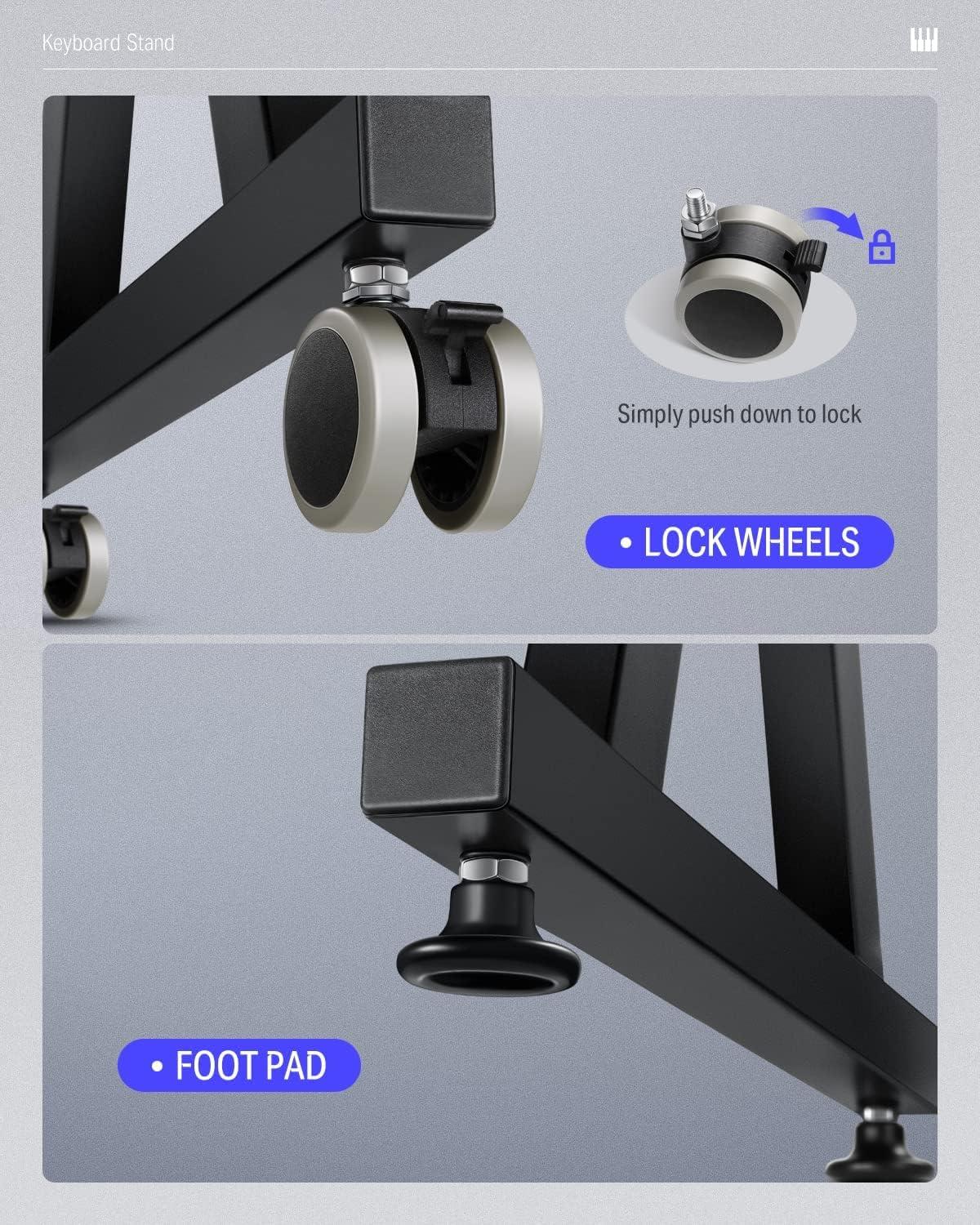 [Piano Stand] This product includes lockable universal wheels that allow you to move the stand smoothly anywhere. When you don't need to use the wheels, you can switch the footpads to fix it. (Note: When using the universal wheel, remember to lock the wheel after the piano is placed on the piano stand.)