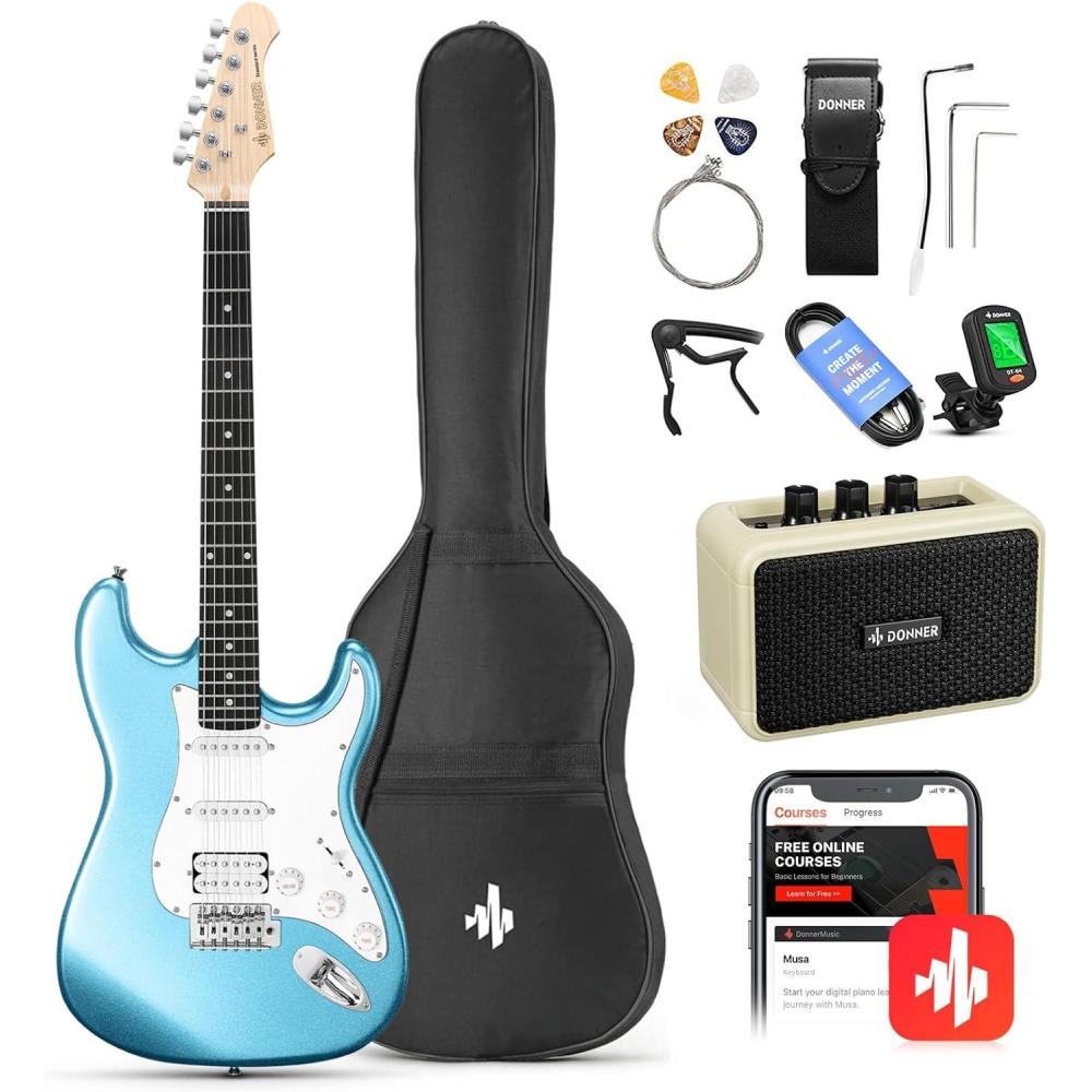 Donner DST-100B 39 Inch Electric Guitar Beginner Kit Solid Body Full Size Black HSS for Starter, with Amplifier, Bag, Digital Tuner, Capo, Strap, String,Cable, Picks(Lake Blue)