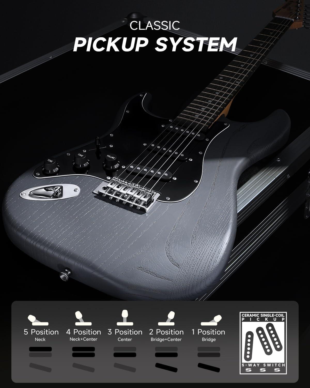 CLASSIC TONES, ENDLESS ZONES:With its classic SSS pickup configuration and 5-way switch, this electric guitar delivers bright, dynamic tones—ideal for country, blues, and funk, and perfect for exploring timeless sounds. Tone and volume controls add versatility to match any style, helping you unlock your inner guitar legend