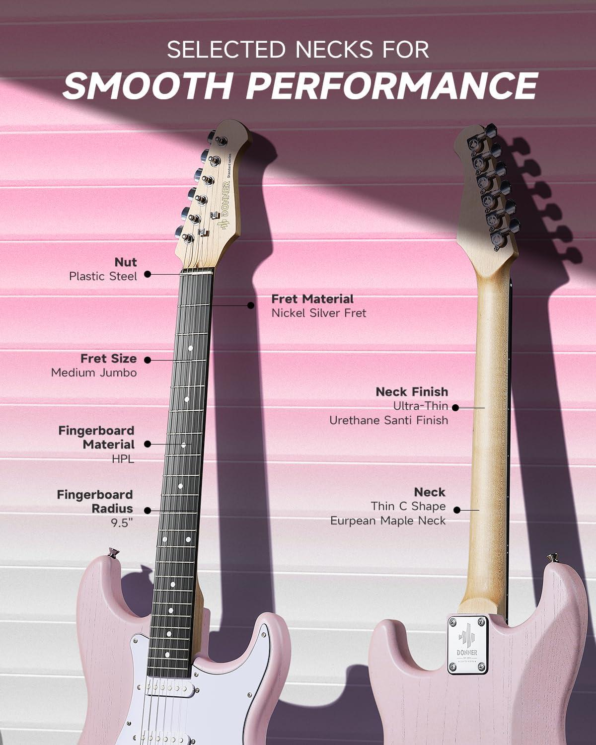 BUILT FOR COMFORT:This beginner electric guitar features an ultra-slim, comfortable C-shaped neck and satin matte finish, plus an easy-to-use circuit system, premium pickguard, and vintage tremolo bridge for a smooth, natural feel