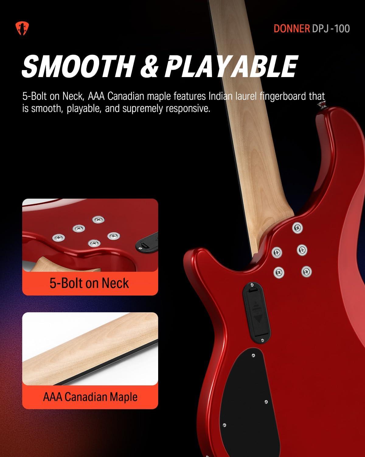[Smooth & Playable]: Donner electric bass with AAA purpleheart fingerboard, AAA Canadian maple neck with the superior finish on the back of the neck provides a smooth fret-hand feel and combines comfort and performance, quality materials improve comfort for your playing. With a “Modern C”-shaped profile, suitable for various playing styles