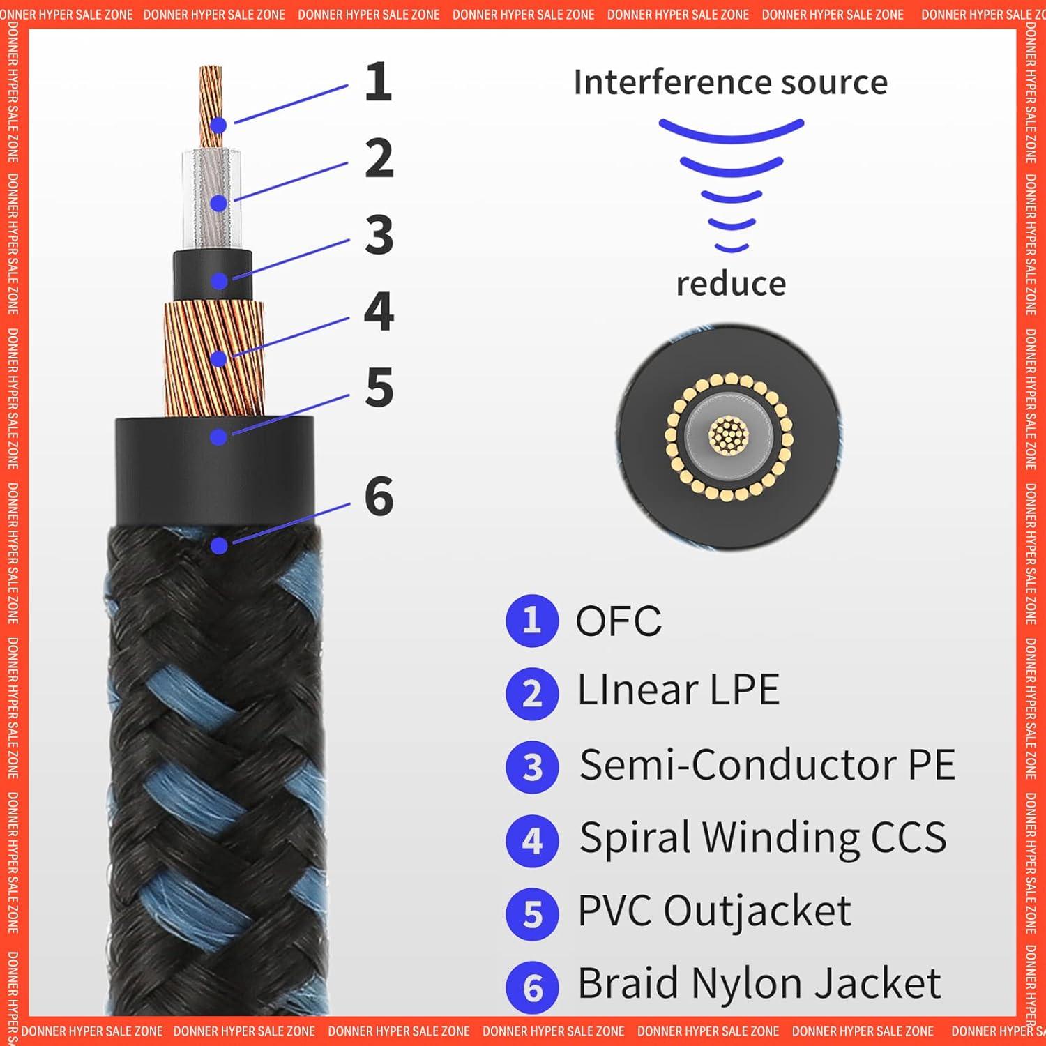 【HIGH FIDELITY】 Donner guitar cable with 24AWG oxygen-free-copper center conductors and high purity OFC core provides enhanced signal transfer