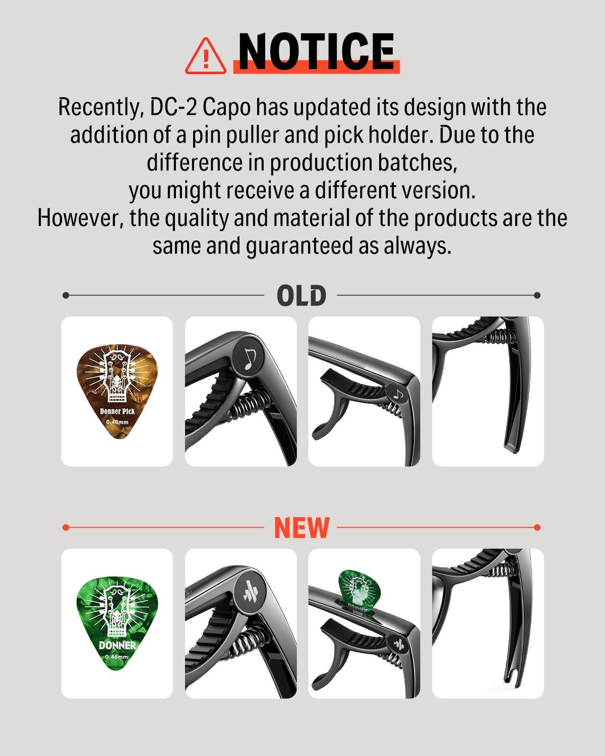 Updated Design: Recently, DC-2 Capo has updated its design with the addition of a pin puller and pick holder. Because of production batch variations, you might receive a different version, but quality and materials remain consistent