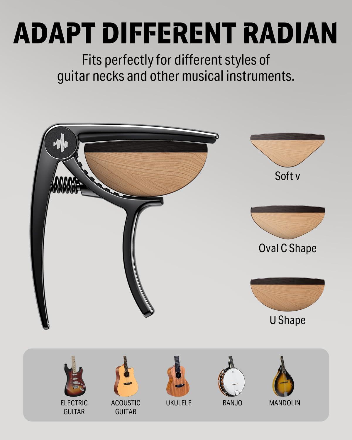 Ease of Use Across Instruments: Designed to fit a variety of stringed instruments including electric and acoustic guitars, ukuleles, banjos, and mandolins, this capo features a smooth surface and an ergonomic handle for effortless use