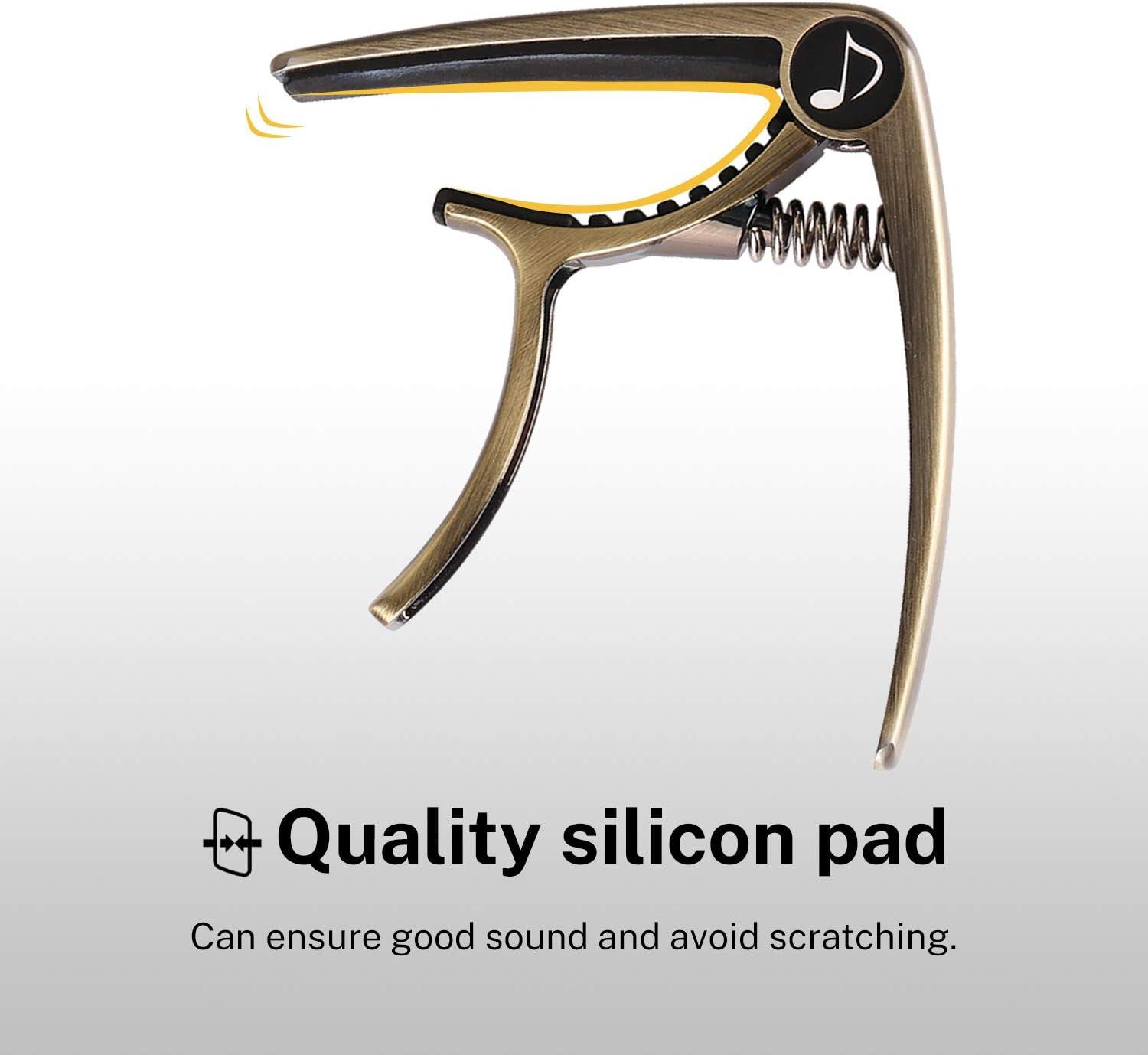 Secure Grip and String Protection: Equipped with soft rubber pads, this capo offers a firm grip on the strings for consistent tension, while also safeguarding your instrument from scratches with its high-quality silicone padding