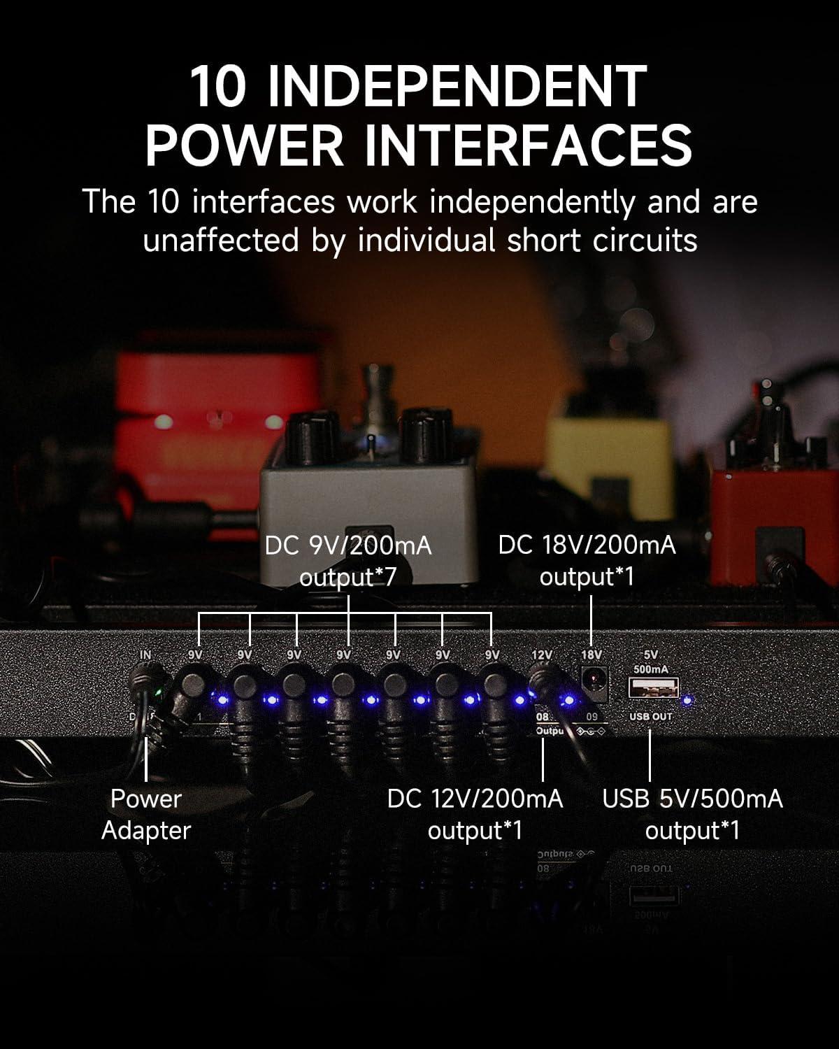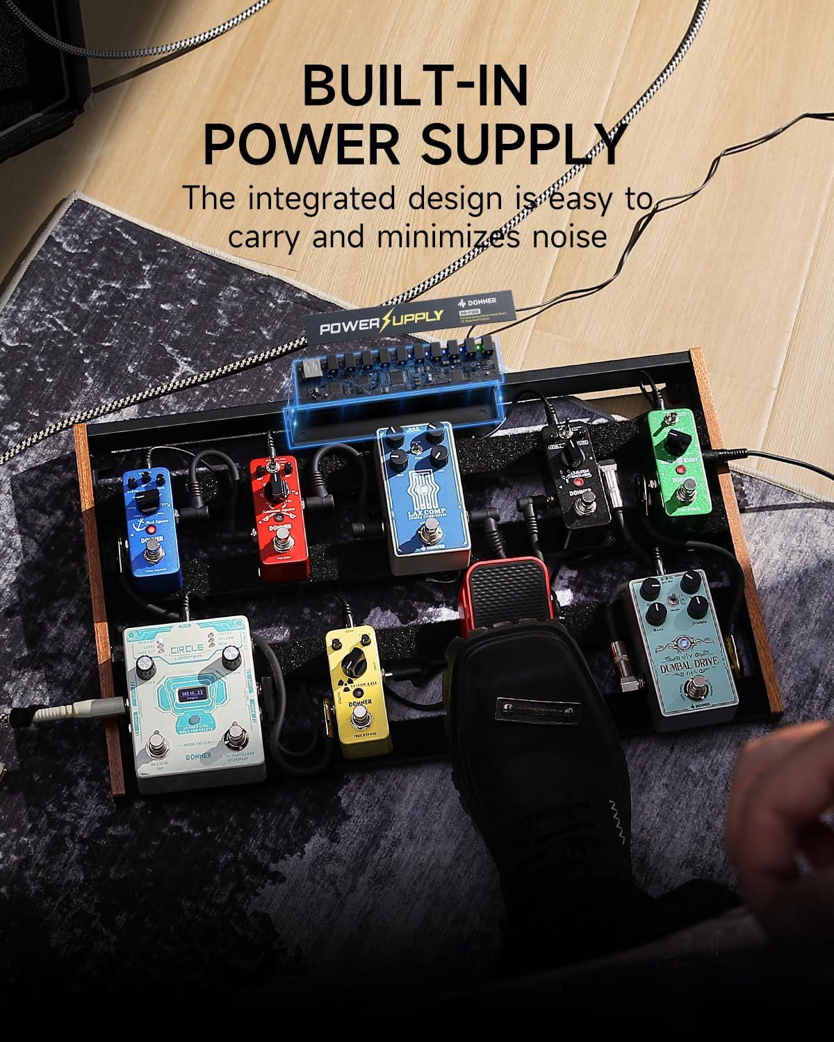【Built-in Power Supply】The powered pedalboard with built-in power supply provides clean and quiet power for pedals, with each channel featuring individual short-circuit protection, ensuring no noise interference