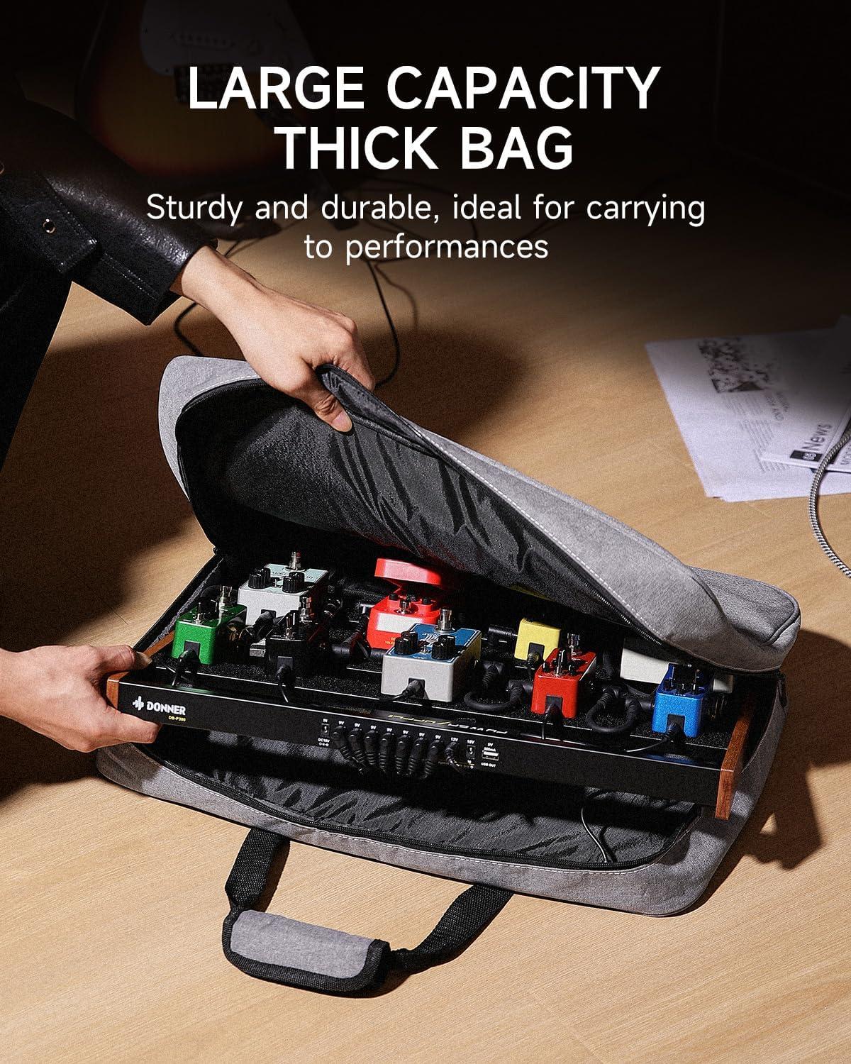 【Functional Kit】Includes a sturdy backpack, adapter plug*1, cables*8, hook and loop tape*2, and zip ties*10. The bag has enough capacity to fit both the pedalboard and pedals