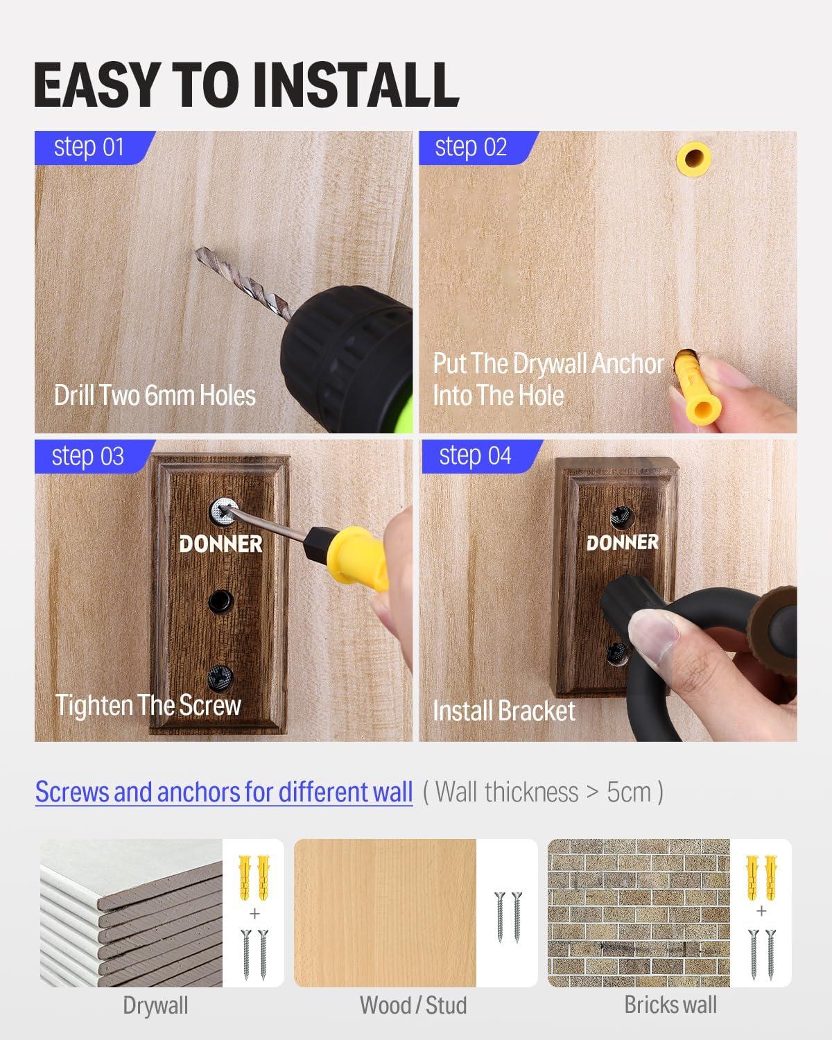 【High compatibility】 Donner guitar hook securely attaches your Acoustic Electric Guitars, Bass, Folk Ukulele, Violin, Mandolin, or Banjo to the wall of your home studio, bedroom, office, or rehearsal space