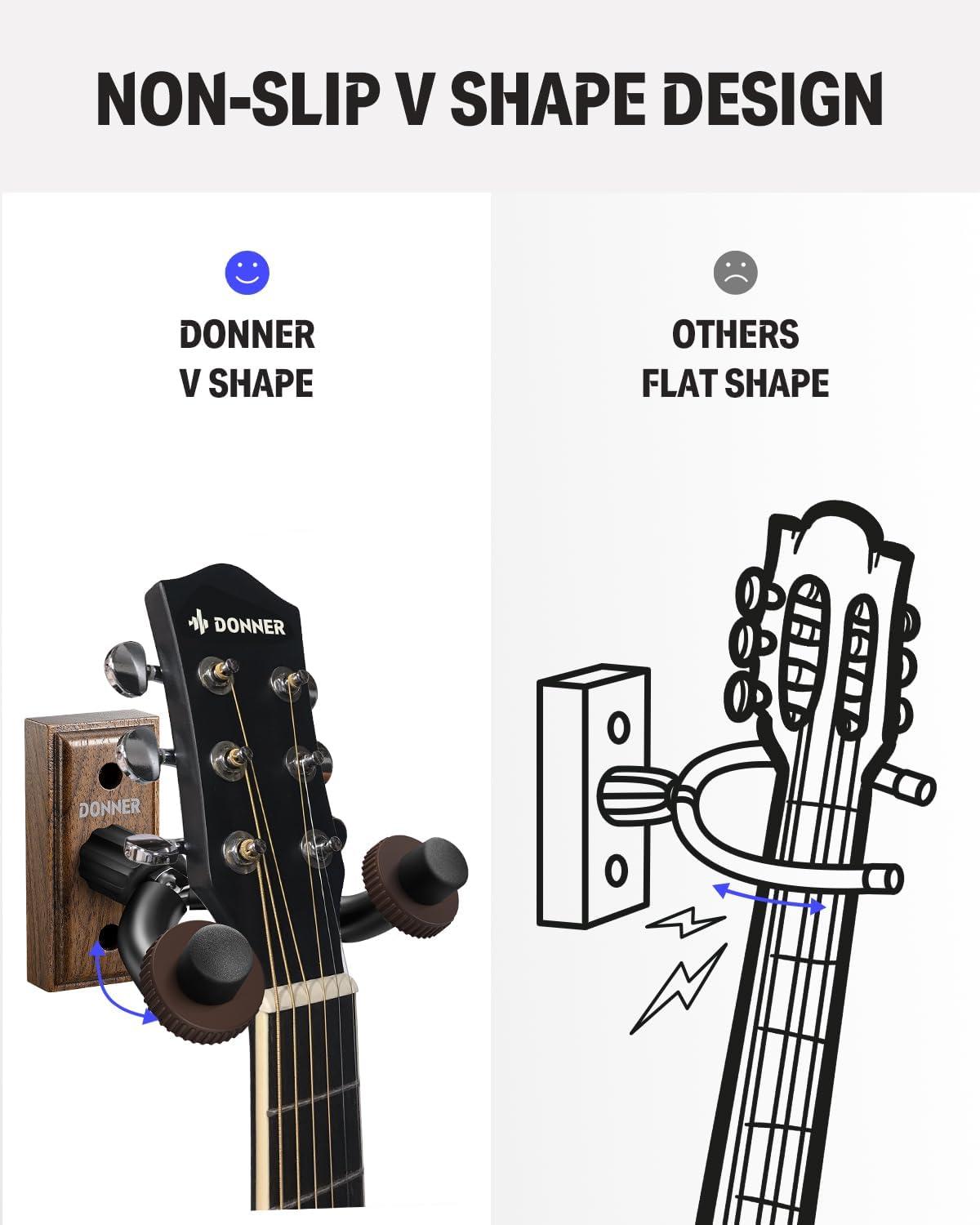 【Rotating design】The Donner guitar hanger is intended to rotate slightly to accommodate non-symmetrical headstocks. It can be used with different types of guitars