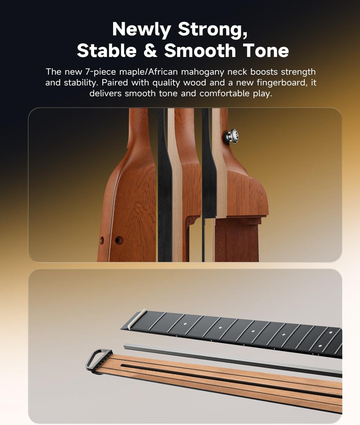 【Upgraded Neck Construction】Upgraded to a 7-piece maple and African mahogany neck for greater strength, stability, and warp resistance. The slim C-shape, integrated design, HPL fingerboard, and bone nut ensure smooth playability, balanced resonance, and a warm, natural tone across climates.