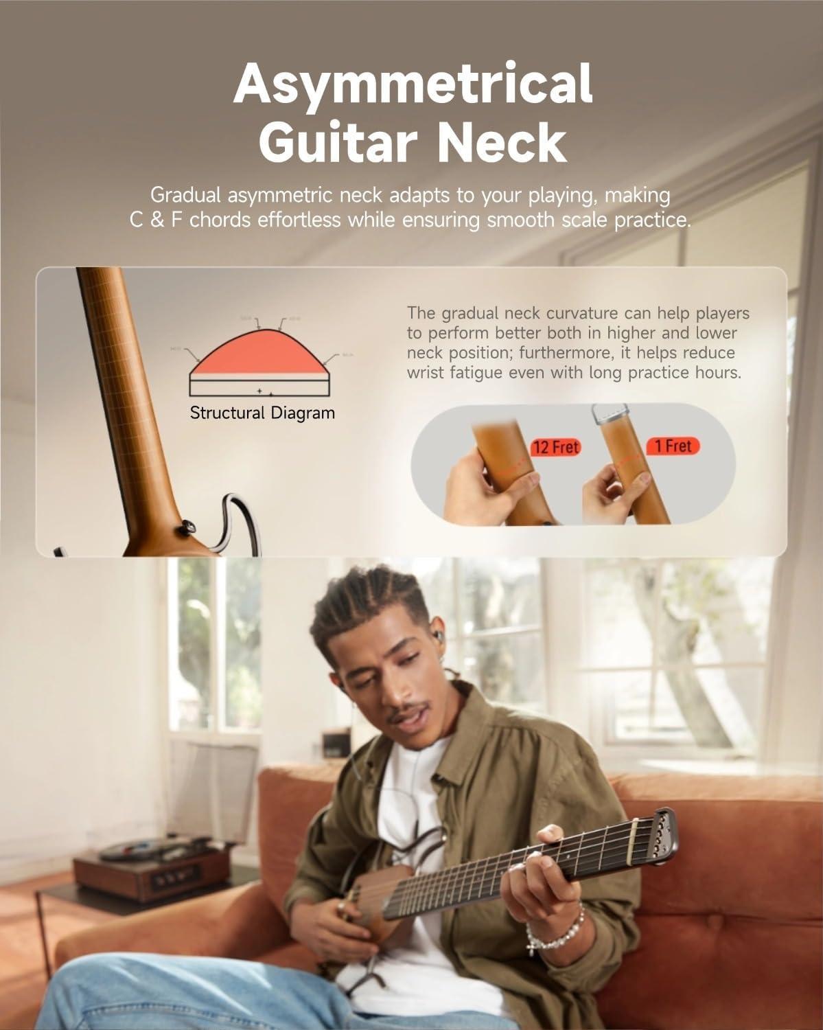 [Make Practice More Comfortable] – The HUSH travel guitar acoustic has an asymmetrical guitar neck, which helps players perform better both in higher and lower neck positions while reducing wrist fatigue during long practice sessions. Customized round frets are beginner-friendly to prevent finger cuts during practice