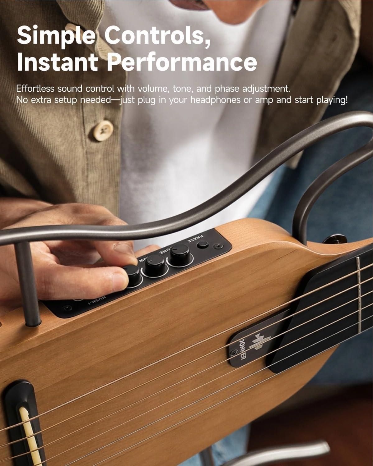 Donner HUSH I Guitar For Travel – Portable Ultra-Light and Quiet Performance Headless Acoustic-Electric Guitar, Maple Body with Removable Frames, Gig Bag, and Accessories(Natrual)