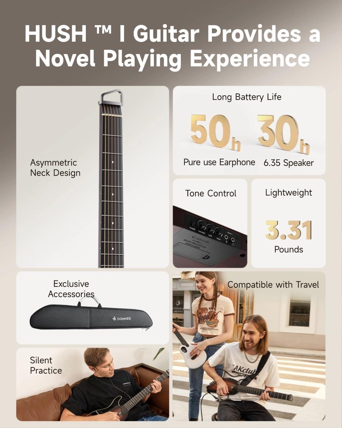 [Best Partner for Travel] – Donner HUSH portable guitar is as lightweight as a laptop with a HEADLESS design, button tuners, and removable frames. The gig bag provided measures 33.5″x 6.7″x 2.2″ and can fit in the airplane overhead bin. Take music on the go with you