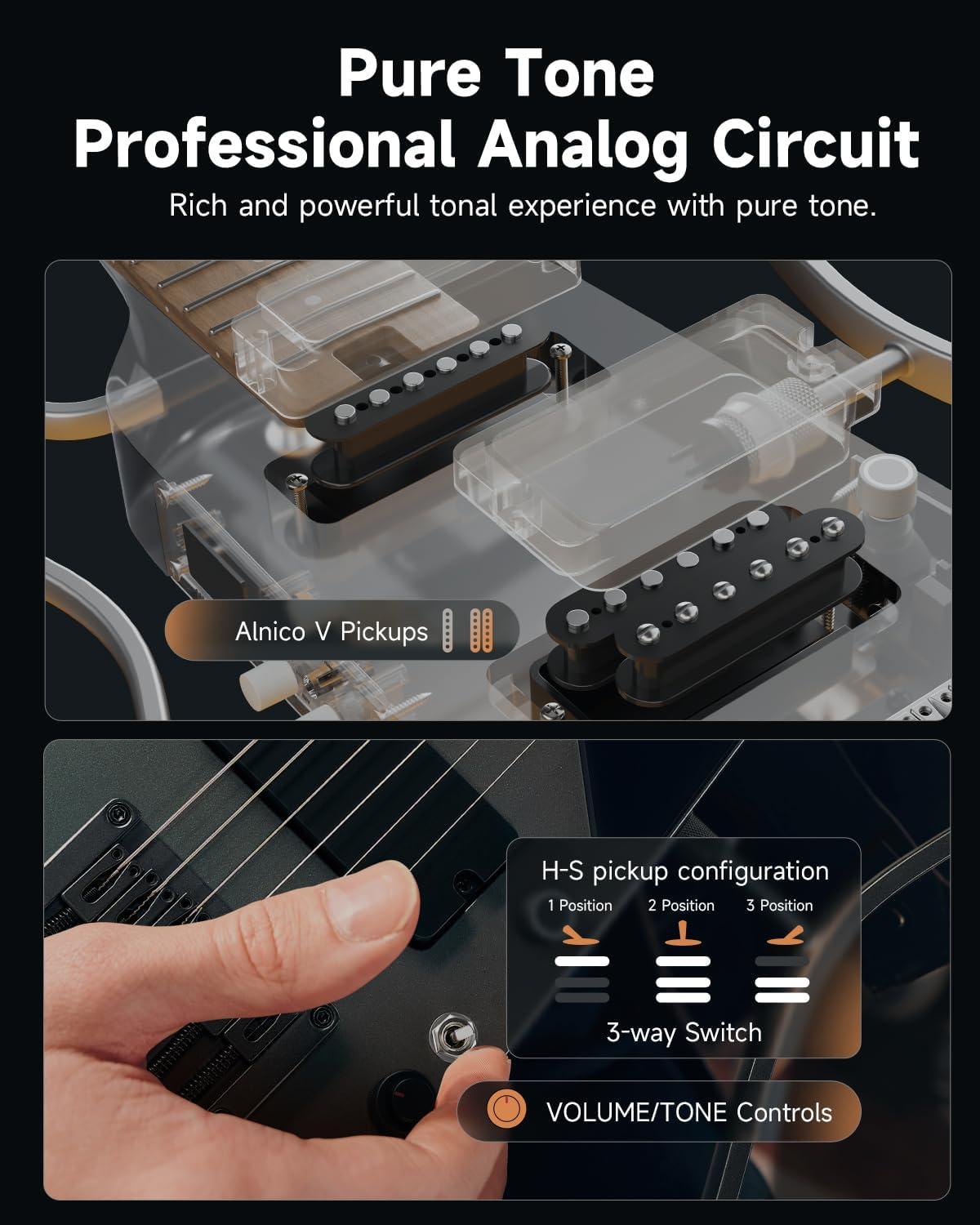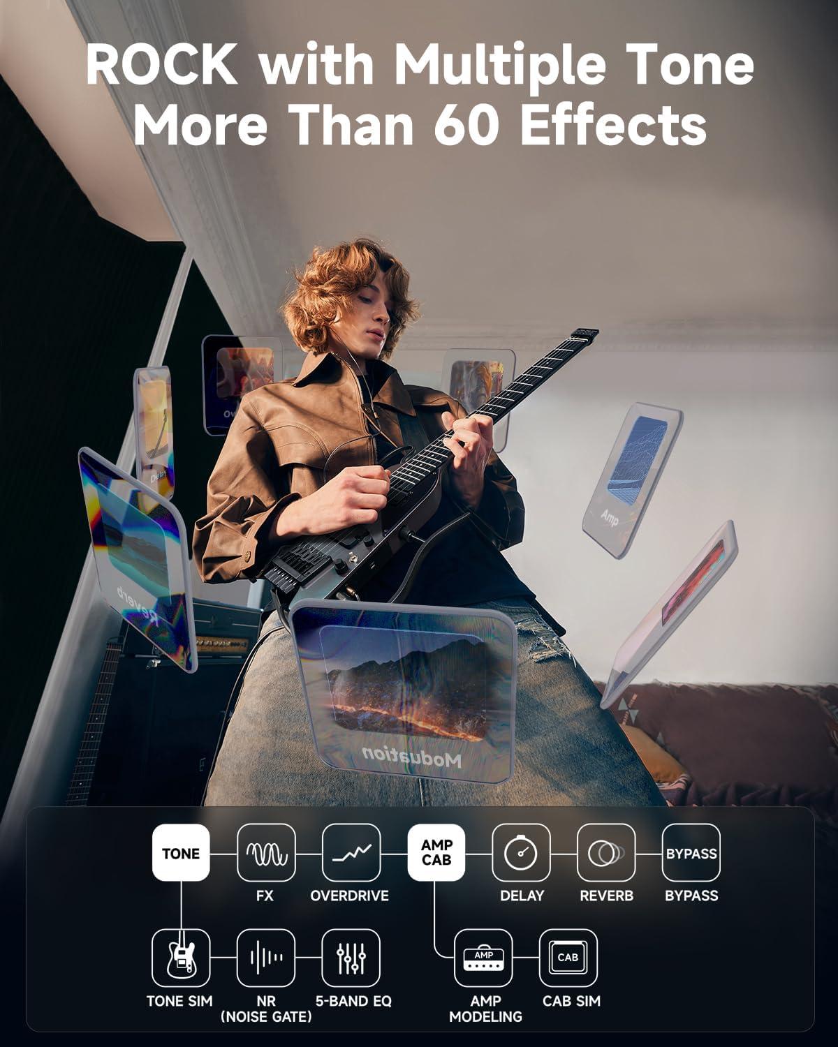 Real Amp Modeling- The DONNER H2 chip, designed and developed in-house, supports more advanced and complex audio algorithms, delivering higher-quality audio sampling. With 19 classic amp models and 12 cabinet simulations, the HUSH X PRO Donner electric guitar allows independent control of each, making it easy to switch between different amp tones during performances, practice, and recording