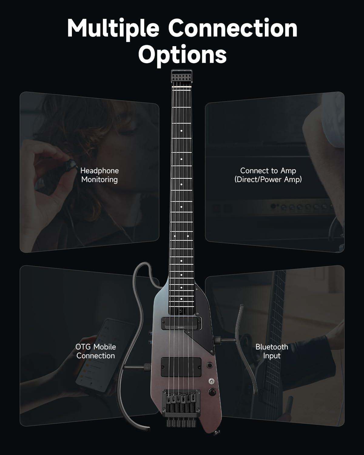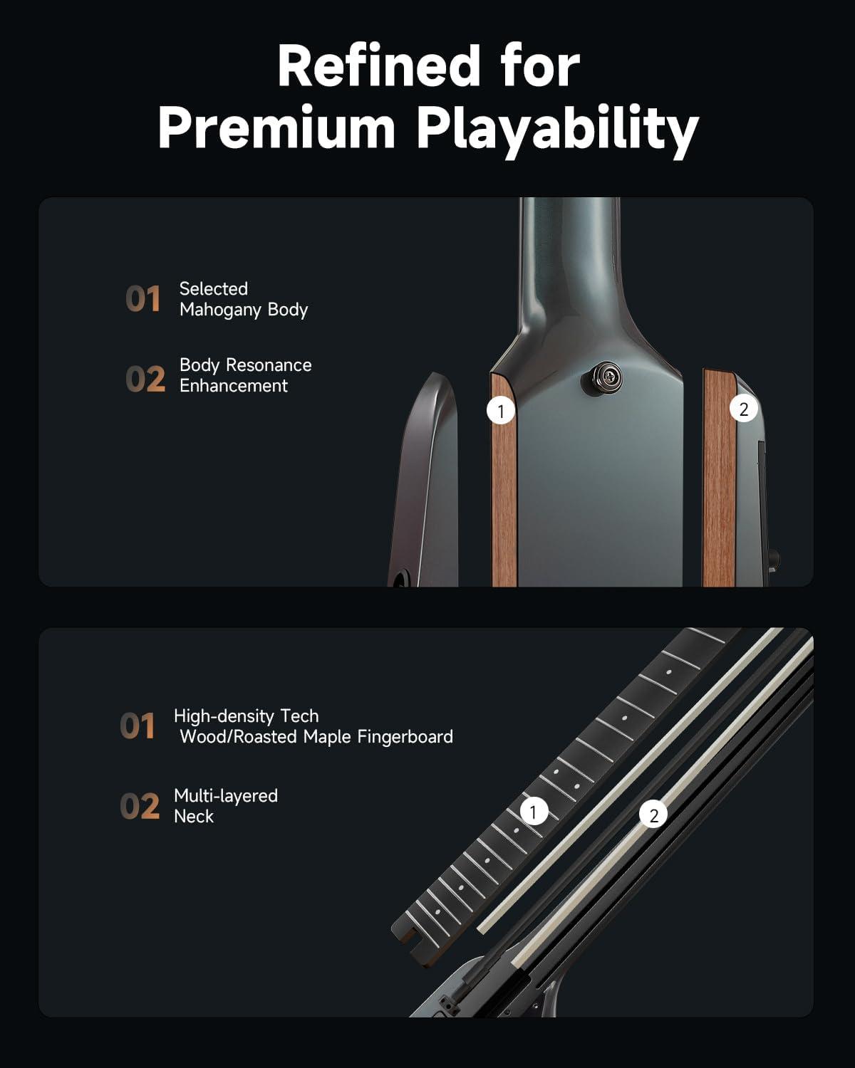 Ultra-light and Portable Design- Building on its portable headless design and upgraded built-in tuner, the HUSH X PRO weighs only 5.5 lbs and is half the size of a traditional guitarra electrica. With up to 5 hours of battery life and a USB-C fast-charging port, it’s perfect for travel, performances, and practice