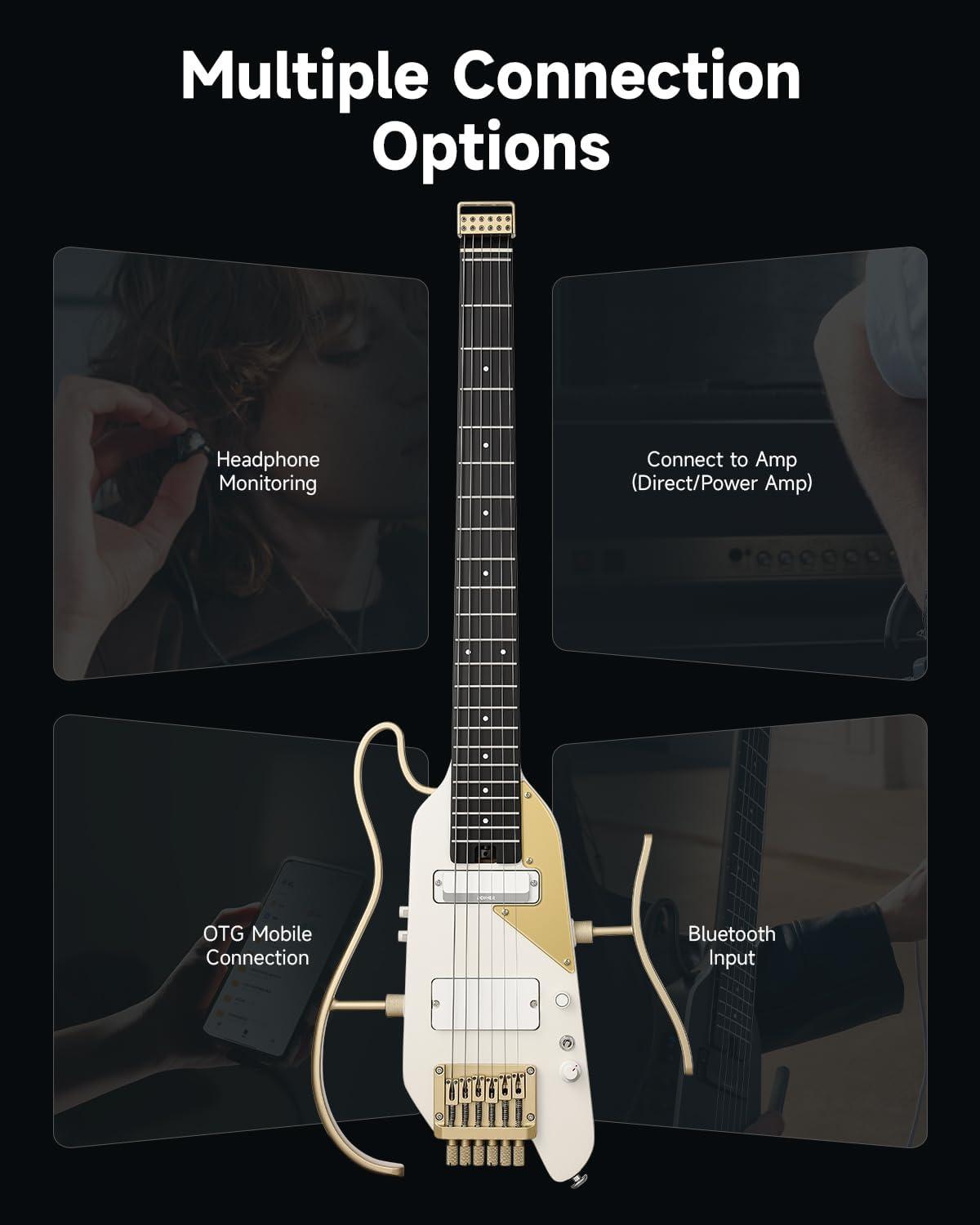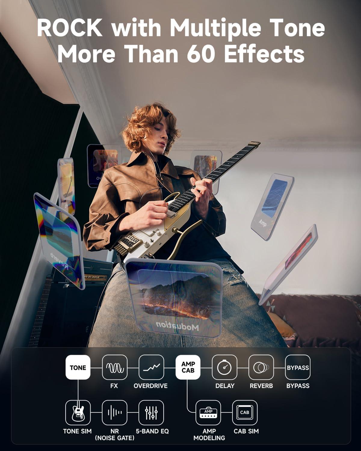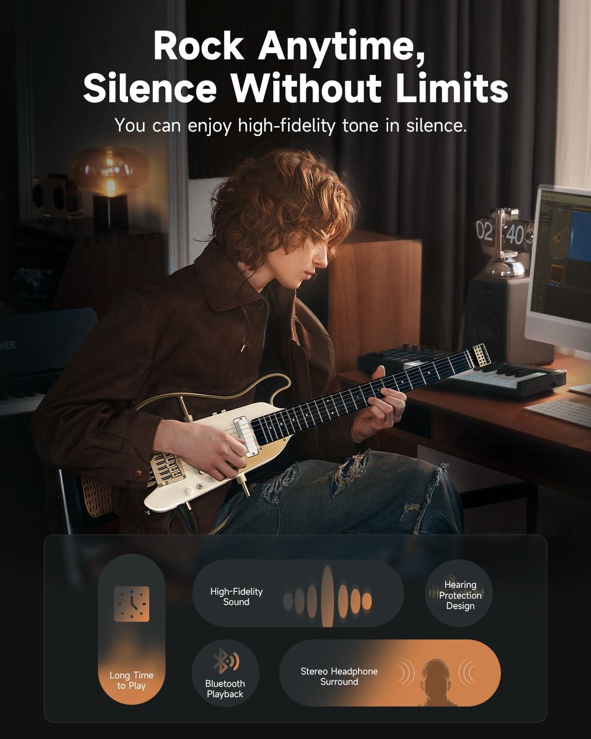 Everything You Need Included – The HUSH X PRO electric guitar kit comes complete with a gig bag, headphones, charging cable, 1/4’ cable, guitar strap, and more—everything you need to kickstart your musical journey