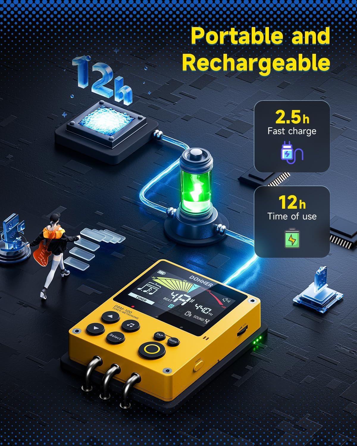 【Rechargeable Lithium Battery】The metronome tuner built-in rechargeable lithium cell, supports long time use and saving you the trouble of replacing batteries frequently. Can be used for acoustic and electric guitars, bass, ukulele, violin, mandolin, piano and wind instruments like saxophone, flute, clarinet and trumpet etc.