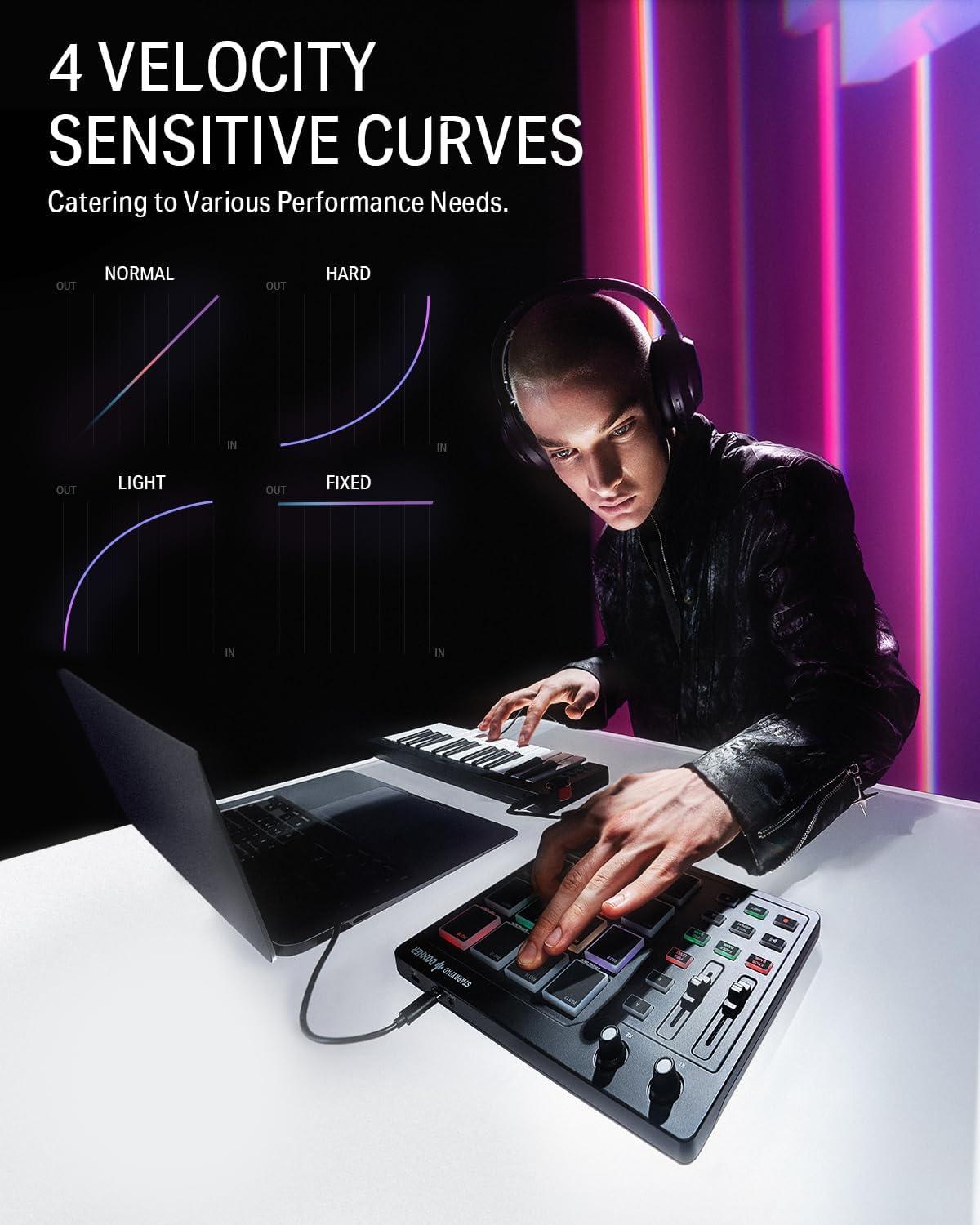 16 Pad Controller with customizable lighting: The midi drum pad STARRYPAD's 16 soft silicone backlit pads can trigger drums, samples, effects and more; One button push allows you to quickly switch between 3 different pad banks for a total of 48 assignable pads; In addition, the beat maker STARRYPAD comes with adjustable velocity sensitivity curves. Perfect for all music makers