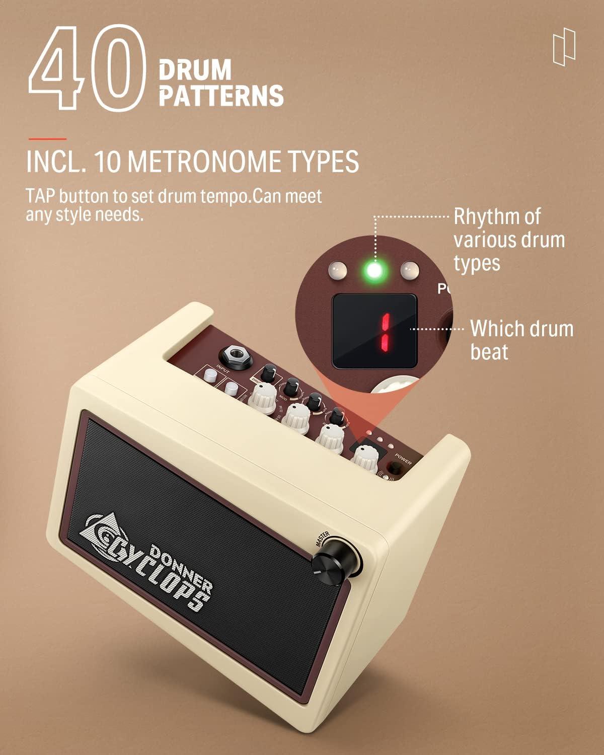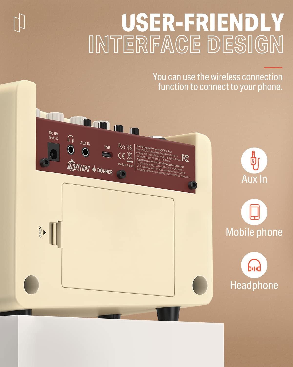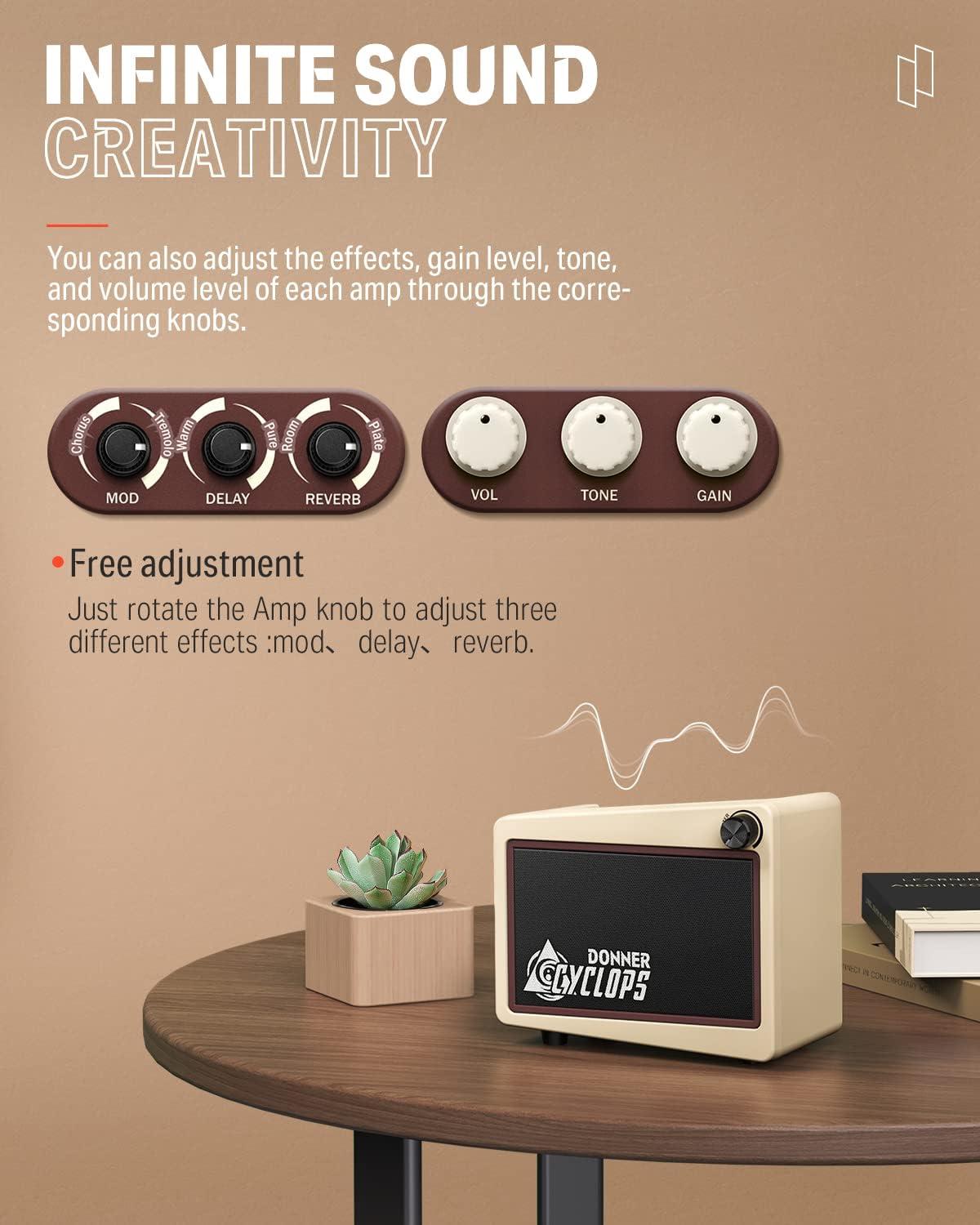 【Beef Up Your Tone】Cyclops is a fresh design drawn from retroelements. It will add luster to your home no matter where you put it! Donner Cyclops is a lightweight, retro design, all-in-one mini guitar combo amplifier. The portable design is great for bedroom practicing, desktop recording, or taking out anywhere jamming with your friends.