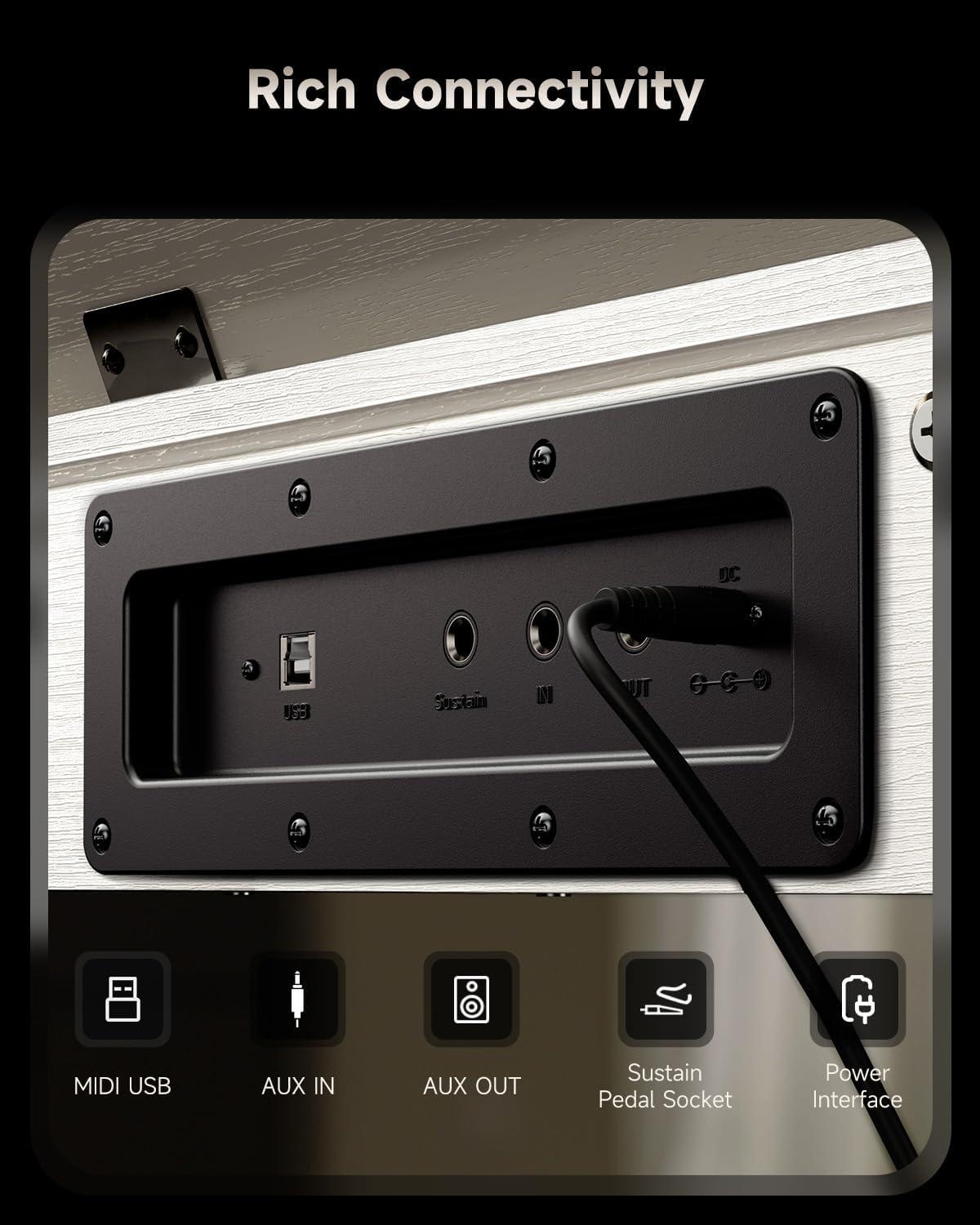 𝑪𝒐𝒏𝒏𝒆𝒄𝒕𝒊𝒗𝒊𝒕𝒚 – ¼” sustain pedal input, USB-MIDI jacks, 3 headphone jacks for private practice( 2 × ¼” stereo jacks under cabinet, 1 jack at back also serves as AUX IN & stereo output for speakers/amps)