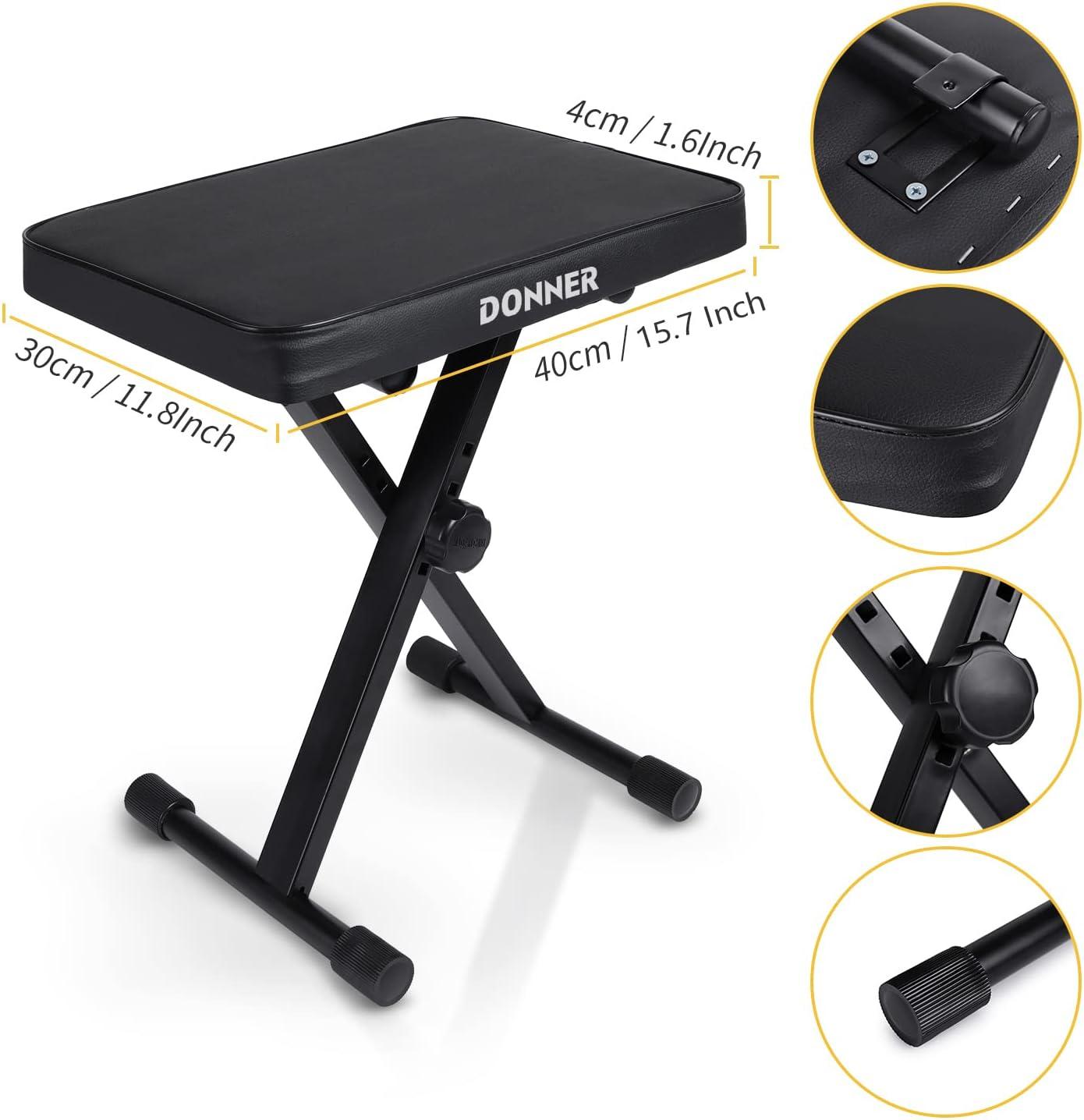 Donner Piano Bench, Adjustable Keyboard Bench Portable Stool Collapsible Chair Foldable Seat X-Style, 2.4 Inch Thickness High-Density Sponge Padded, Non-Skid Design, Black(1.6 Inch)