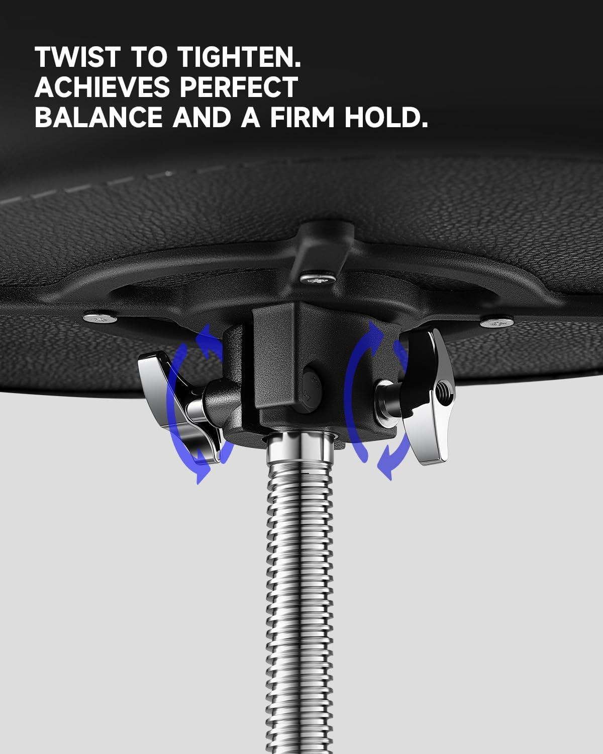 𝐒𝐭𝐚𝐛𝐥𝐞 𝐇𝐞𝐢𝐠𝐡𝐭-𝐀𝐝𝐣𝐮𝐬𝐭𝐦𝐞𝐧𝐭 𝐒𝐭𝐫𝐮𝐜𝐭𝐮𝐫𝐞: The upgraded screw-adjustment structure keeps the drum stool securely locked even after prolonged use. With an adjustable height range of 20.5–26.77 inches (52–68 cm), DT-200 heavy duty drum throne easily adapts to different playing positions for teenage and adult drummers. Minor height adjustments can be made by rotating the seat.