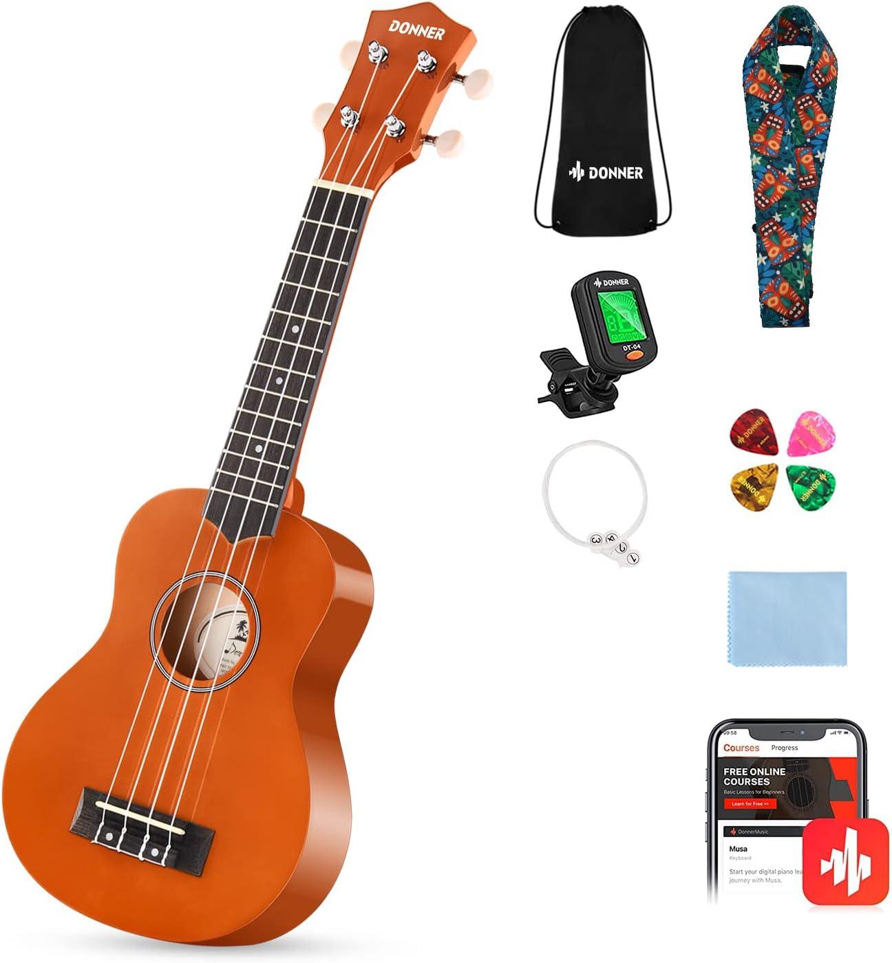 Donner Soprano Ukulele for Beginners 21 Inch Ukelele Starter Bundle Kit with Free Online Lessons Bag Strap String Tuner Picks Cloth Ukalalee Yukalalee (Black)(Orange)