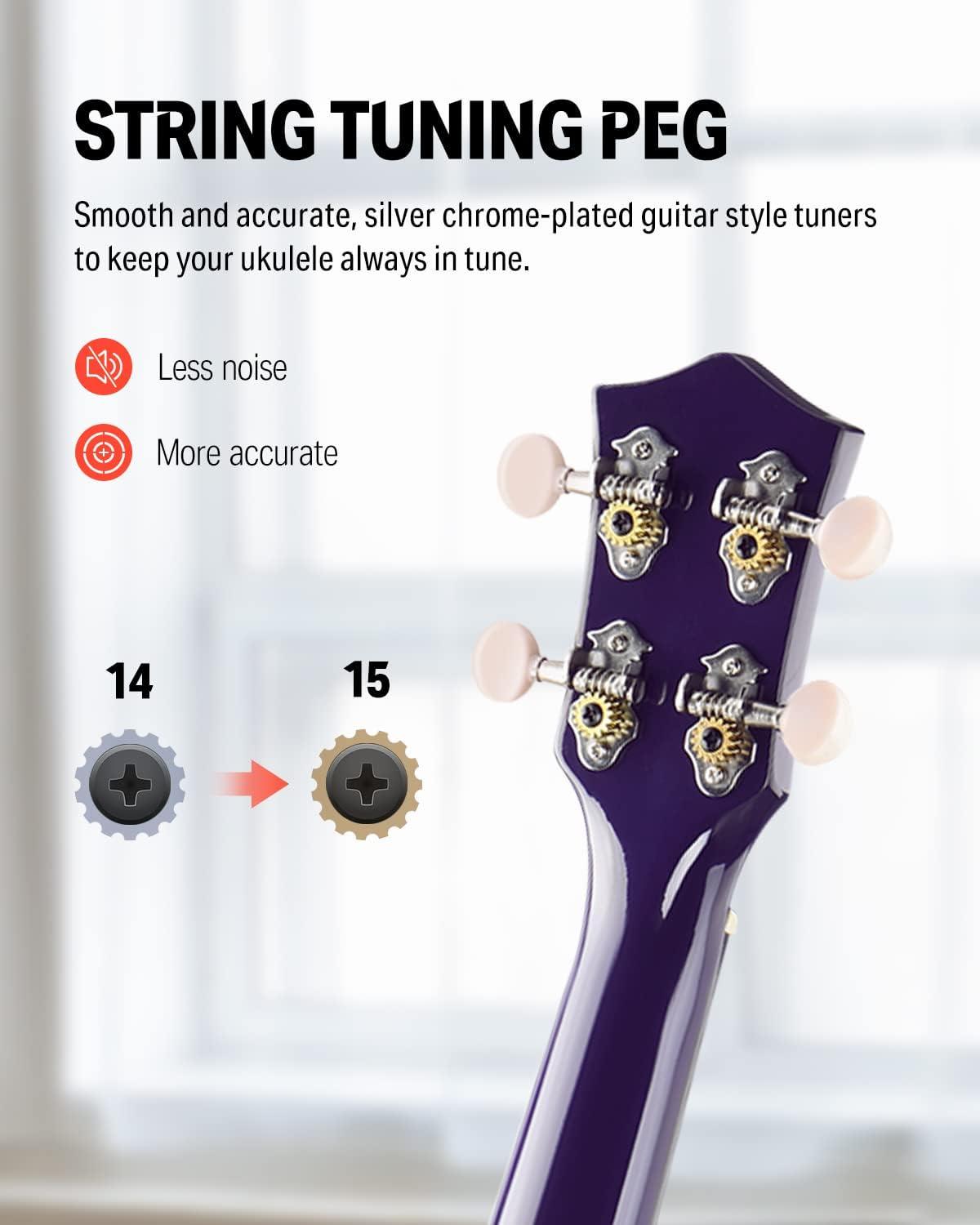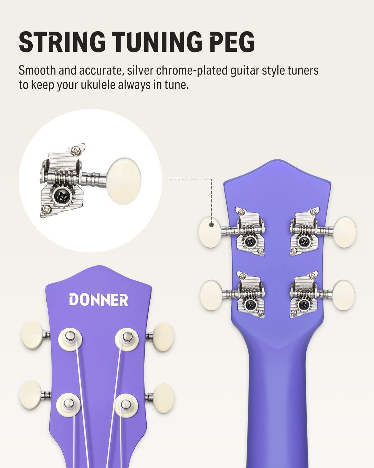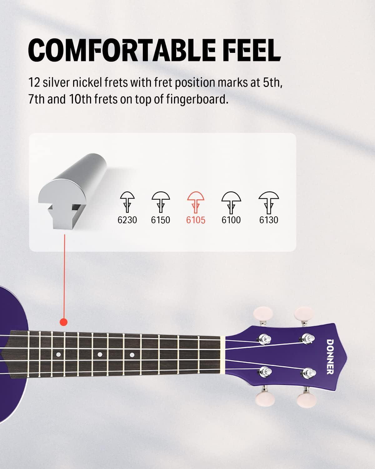 [STRAIGHTFORWARD TUNING PROCESS] Keep your ukulele always in tune with Donner's patented chrome-plated guitar-style tuners. The digital clip-on tuner makes tuning easy, and the 12 brass frets have fret position marks at the 5th, 7th, and 18th frets on the neck and top of the fingerboard.