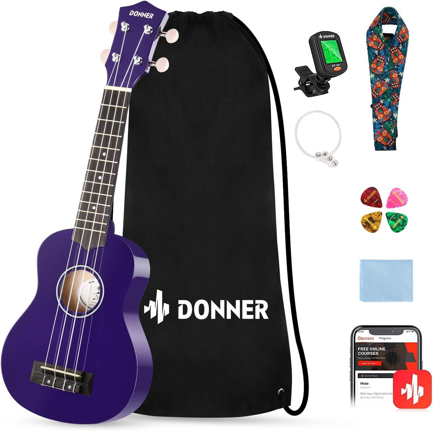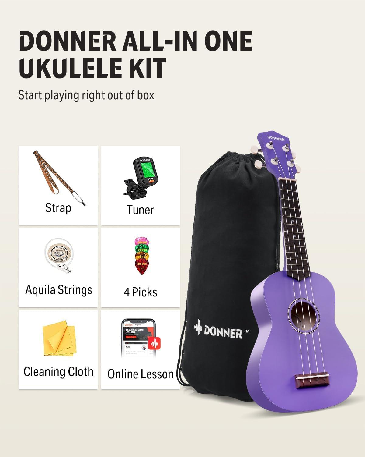 Donner Soprano Ukulele for Beginners 21 Inch Ukelele Starter Bundle Kit with Free Online Lessons Bag Strap String Tuner Picks Cloth Ukalalee Yukalalee (Black)(Purple)