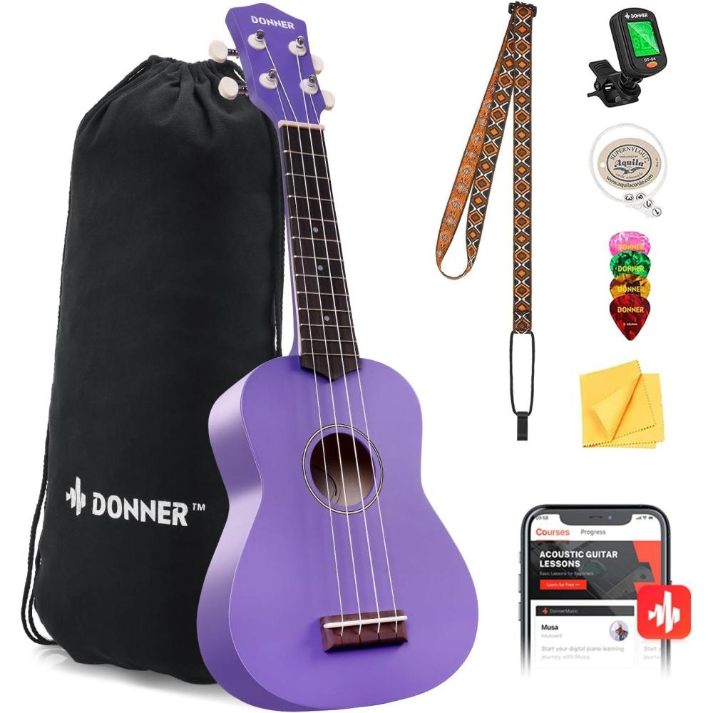 Be the first to review “Donner Soprano Ukulele for Beginners 21 Inch Ukelele Starter Bundle Kit with Free Online Lessons Bag Strap String Tuner Picks Cloth Ukalalee Yukalalee (Black)(Purple)”