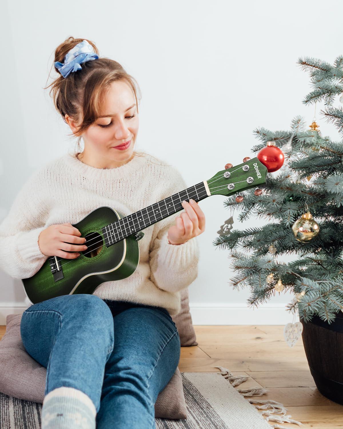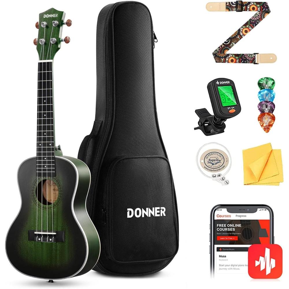 imageDonner Soprano Ukulele Mahogany 21 inch Ukelele Beginner Kit Online Lesson Gig Bag Strap Nylon String Tuner Picks Cloth DUS1 Ukalalee Set Christmas GiftDrak Green
