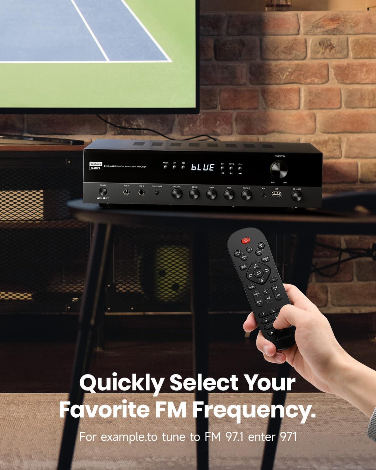 Donner Stereo Receivers, 5.1 Channel Audio Amplifier with Bluetooth 5.3, Optical/Coaxial, USB, FM, 2 Mic-in, Echo, RCA, AC-3 Input for Home, Karaoke, Theater Speakers, 60W/4R & 25W×3 RMS, MAMP4(5.1 CH 60W/4R & 25W×3)