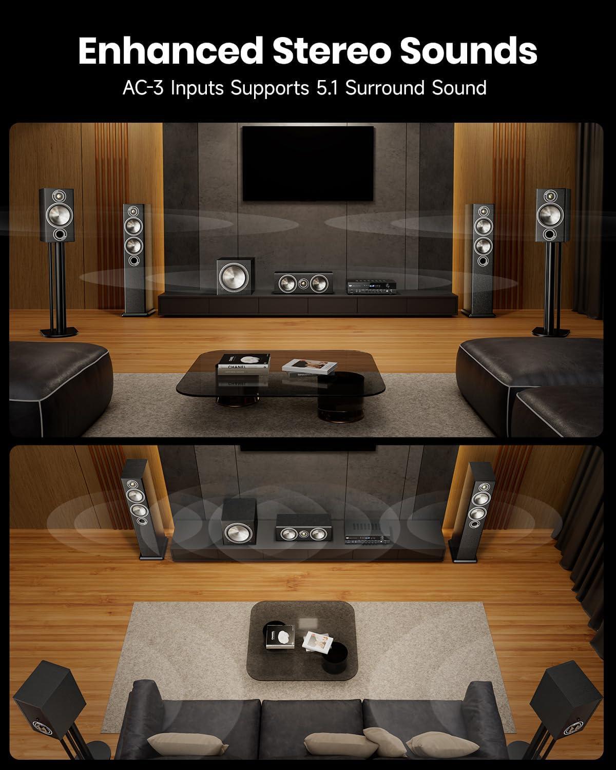 MULTI-INPUT MODES: The audio receiver supports various sound source inputs, including Bluetooth 5.3, USB (up to 64 GB), 1 RCA, 1 AC-3, 2 mic inputs, AUX IN, and FM radio. In addition, digital Optical fiber and coaxial interfaces have been added to fit most smart TVs